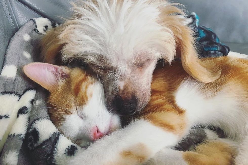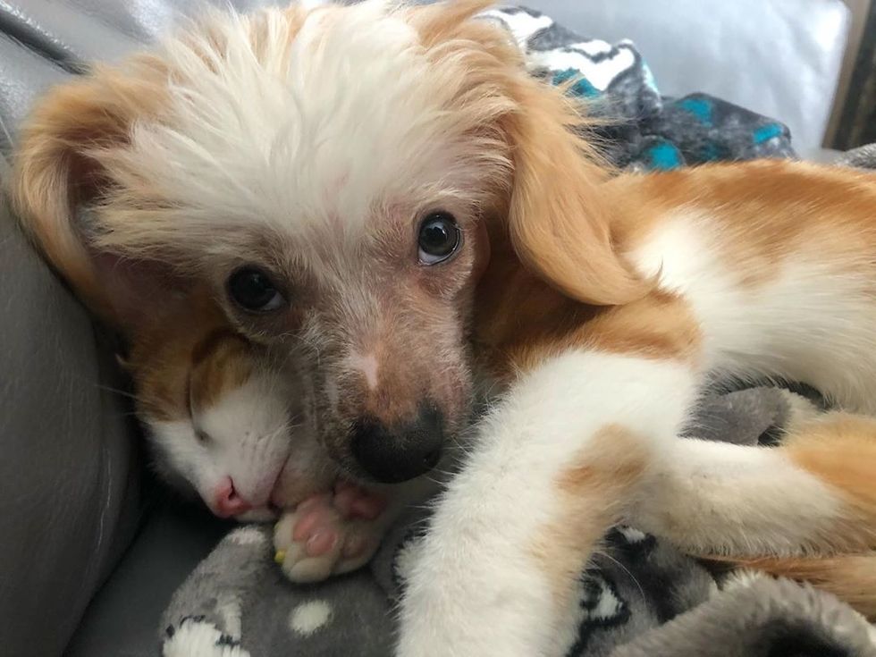 A stray kitten befriended a puppy and decided he would be his best friend.