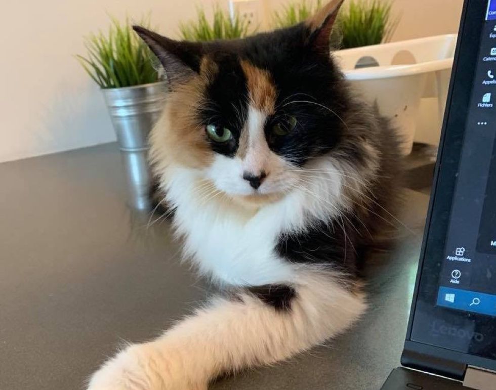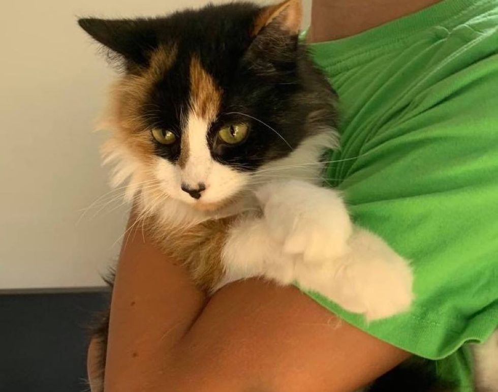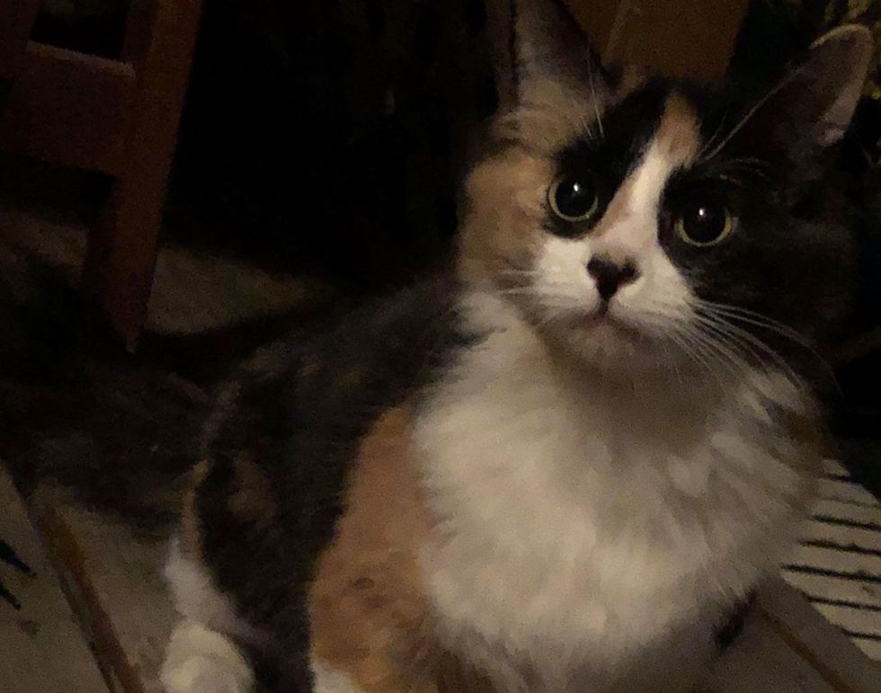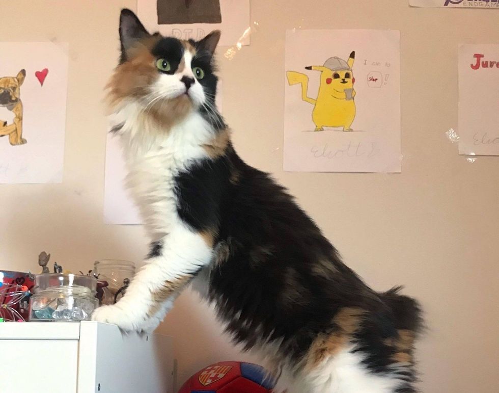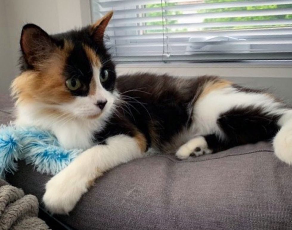 The calico has flourished into a playful, curious, confident cat, who loves running around the house, chasing laser beams.