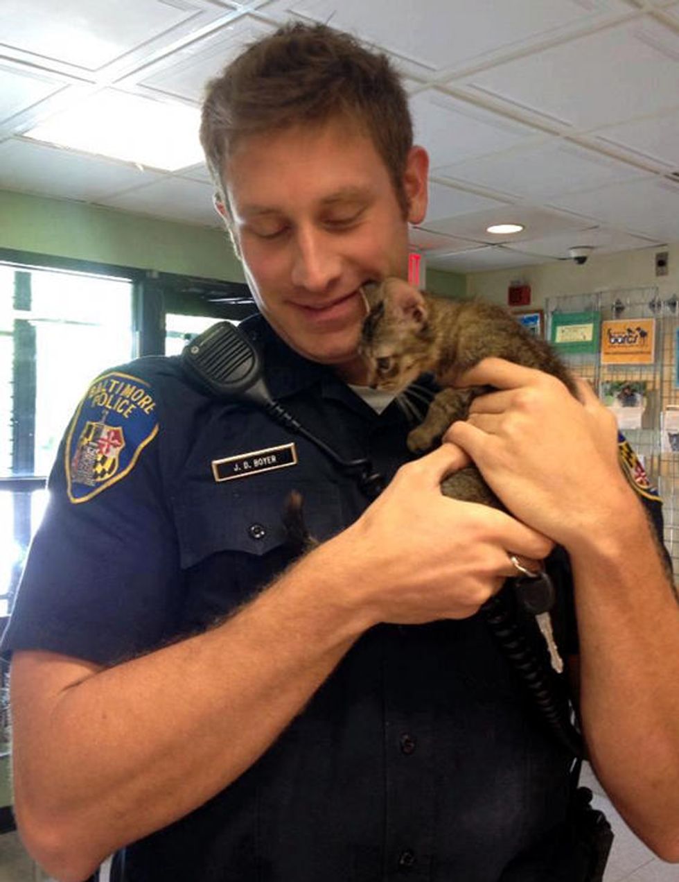 Real men love cats. A tiny stray kitten found a Baltimore police officer to be his human dad for life.