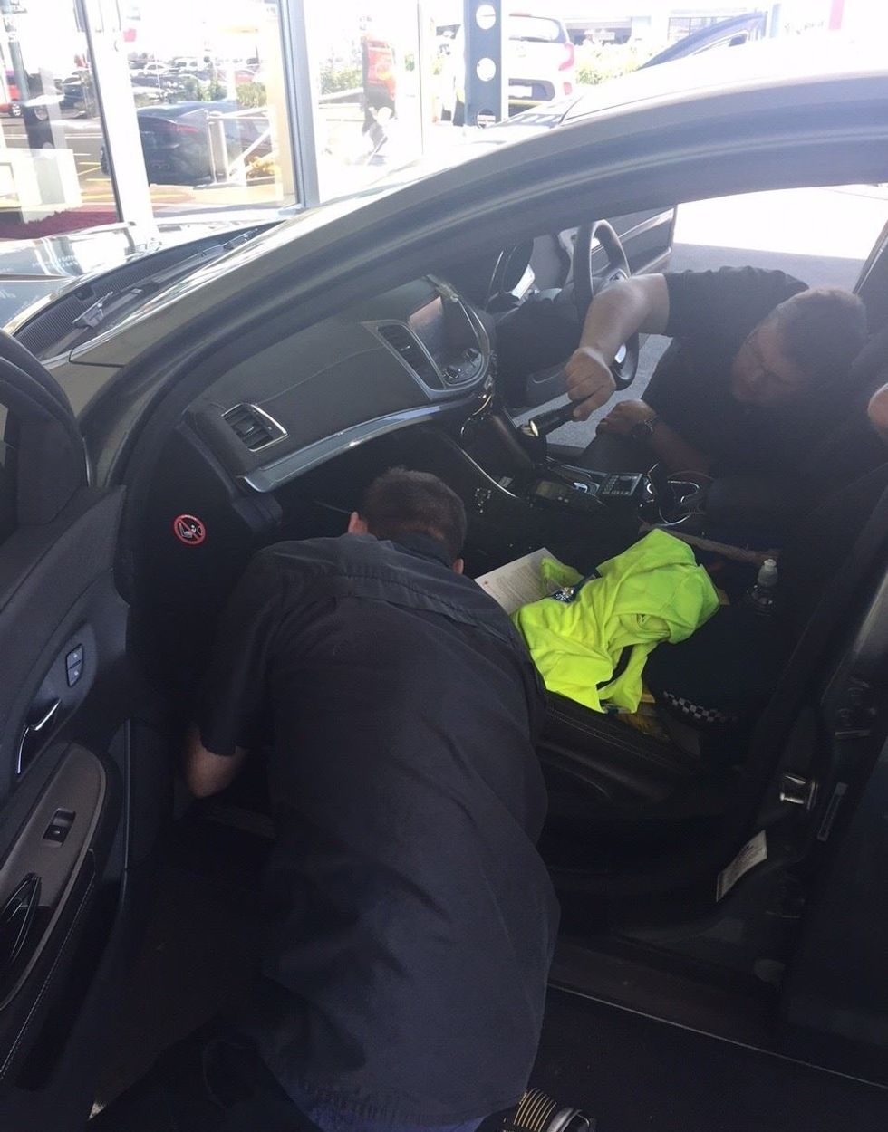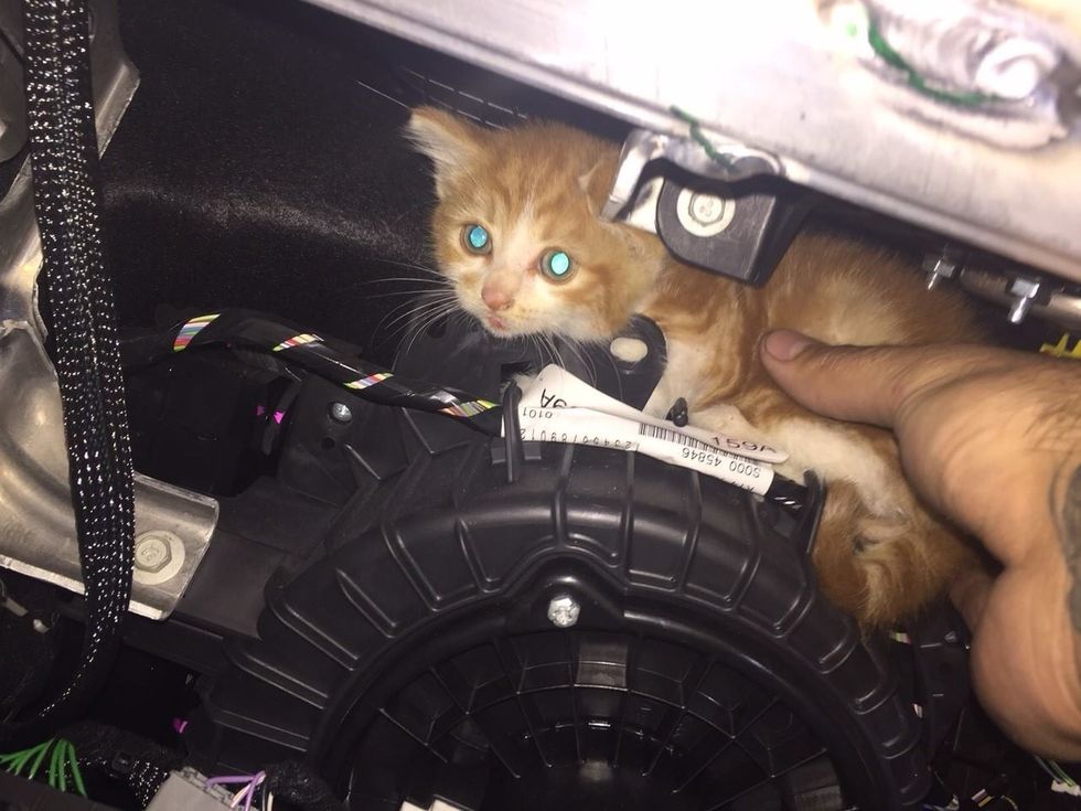 The mischievous feline somehow managed to find a hiding spot inside the patrol car. They took the vehicle to the local mechanics to have the entire dashboard removed.