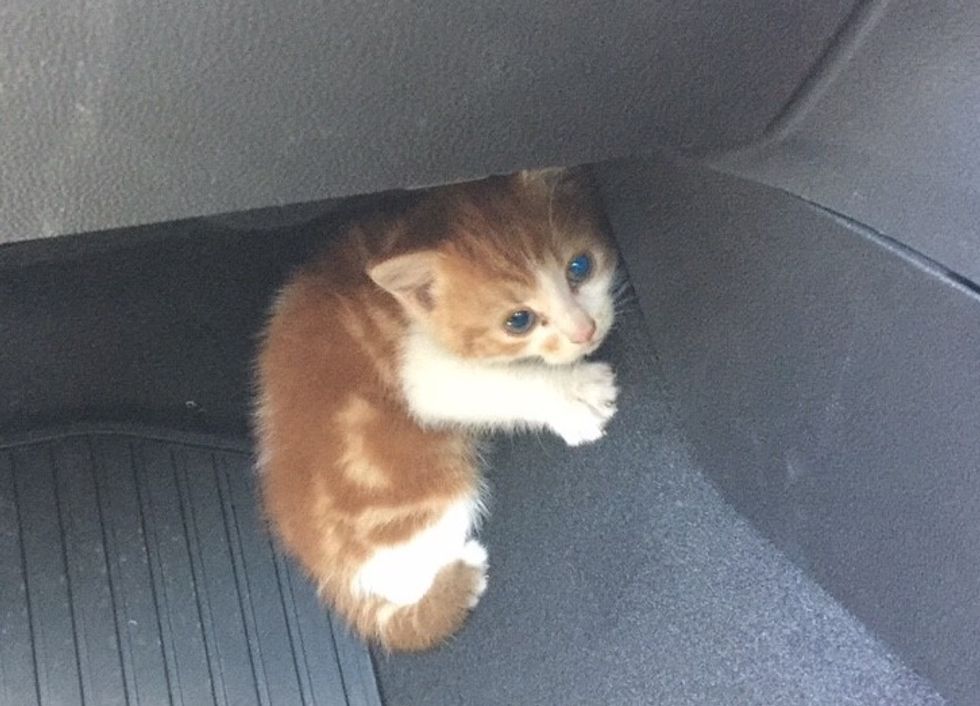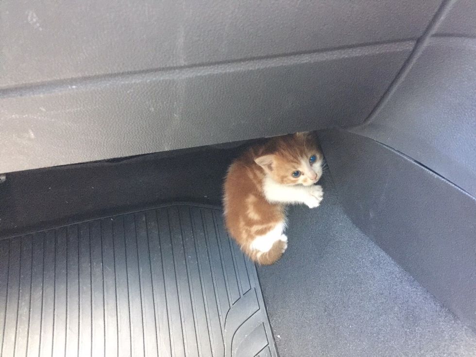After a phone call, the officer realized that the kitten was nowhere to be found until he heard the faintest meow coming from the dashboard.