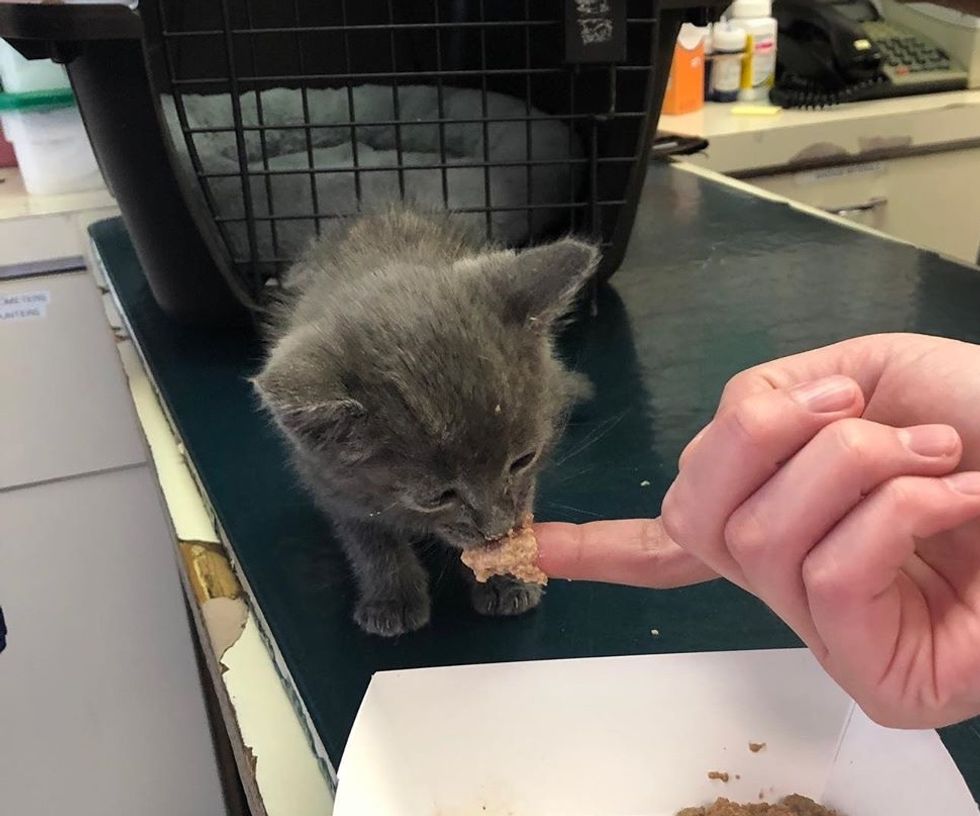 Lilac the gray kitten and her brother were brought to Alley Cat Rescue as strays, two months ago. They were in poor shape, and despite their best efforts to save them, Lilac's brother lost his fight.