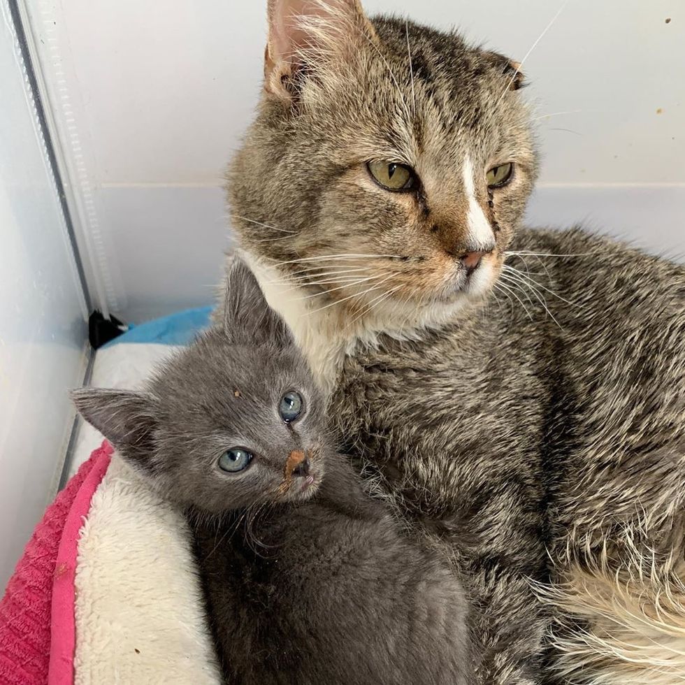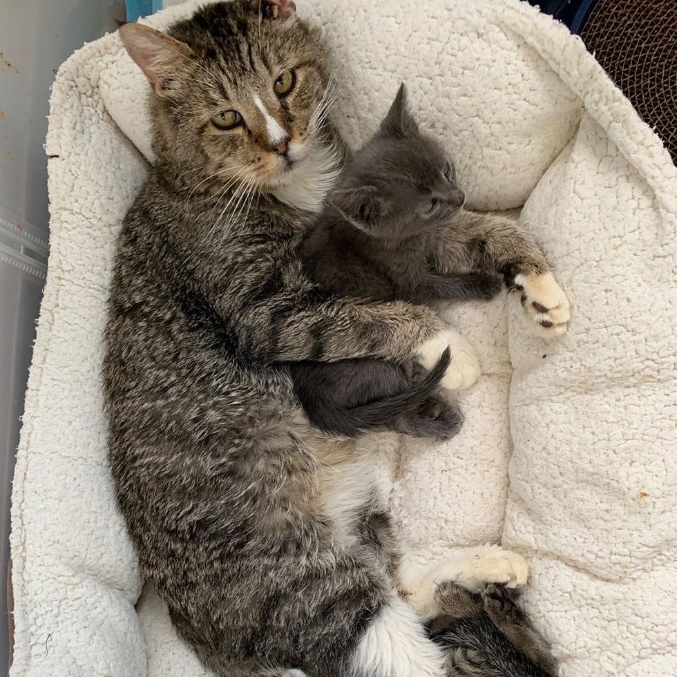 A little stray kitten was so happy when she found a feline friend to cuddle.