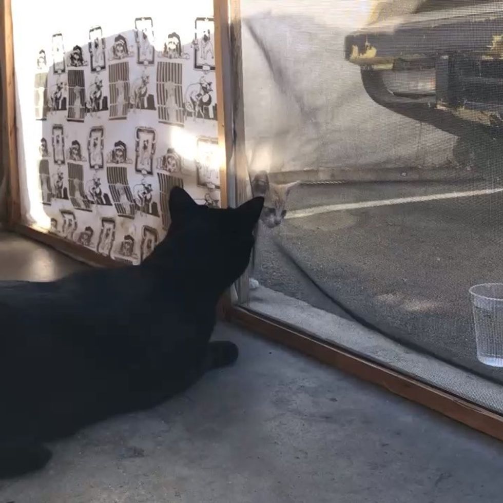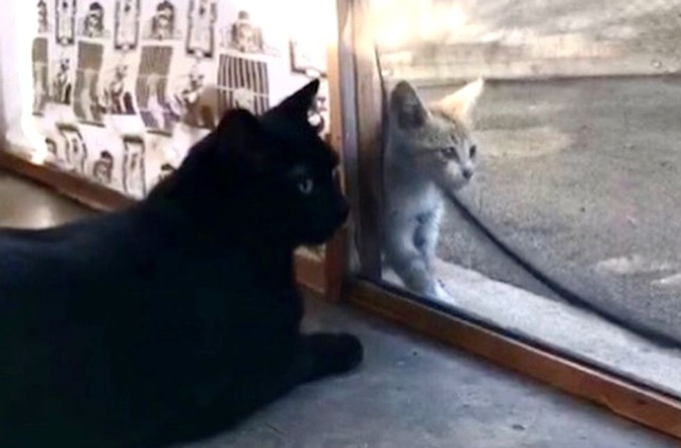 When the kitten saw Grizzly, he started rubbing against the screen as if he was happy to see a friend.