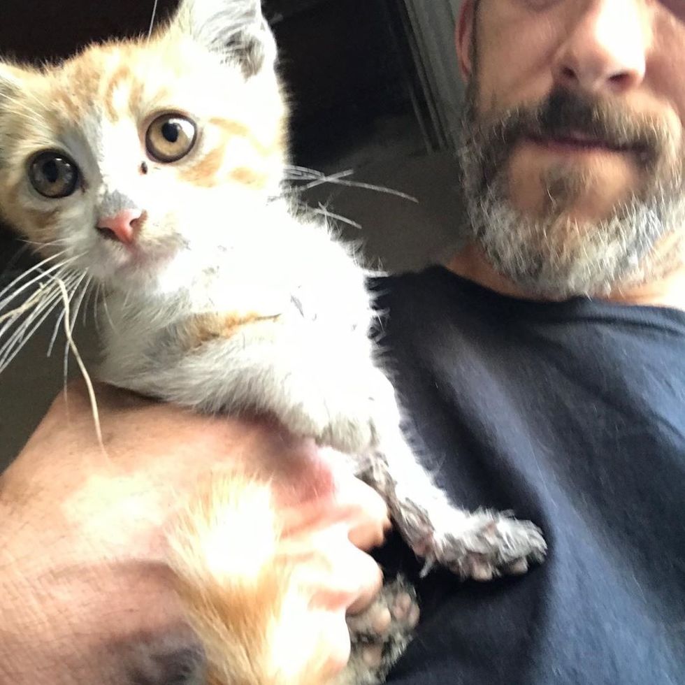 He scooped up the kitten who was dirty and just skin and bones, but seemed so grateful to be found.