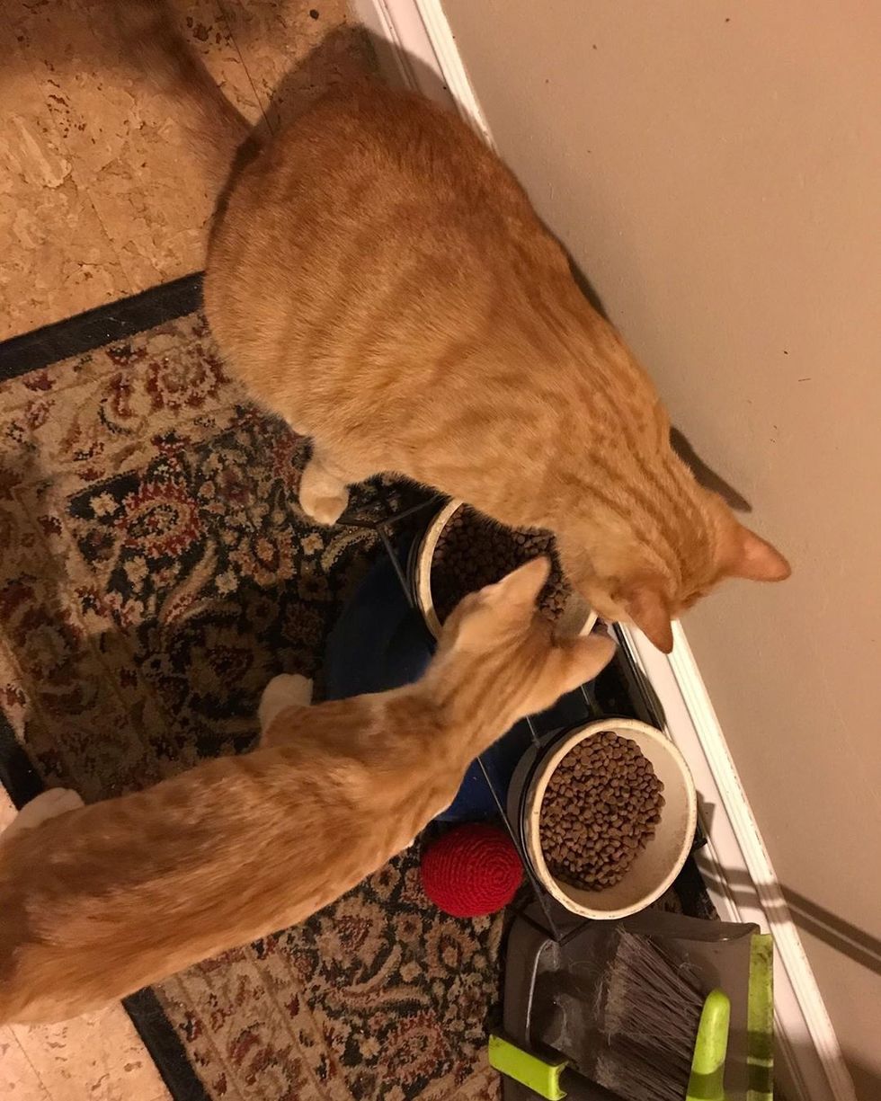 Ollie and Cru like to share food together even though there is a bowl for each of them.