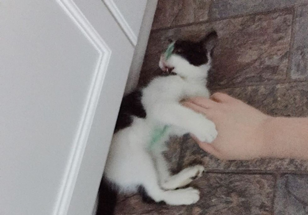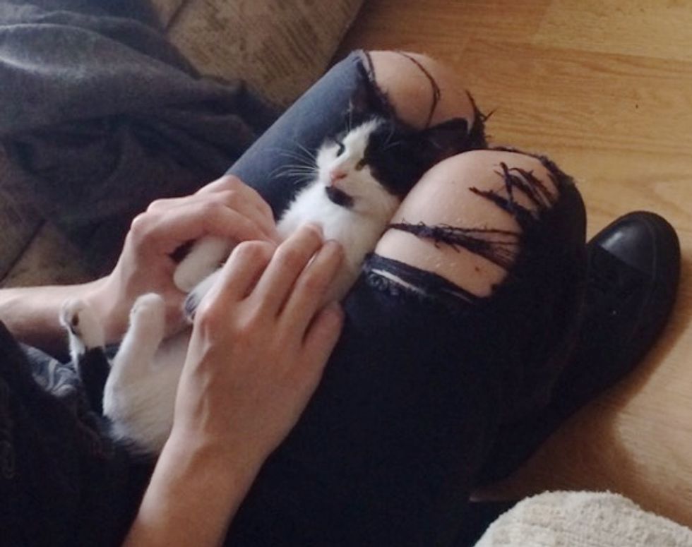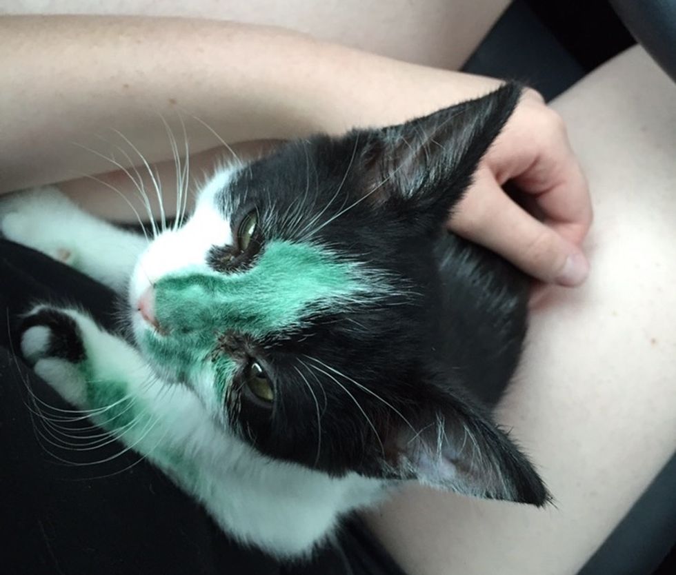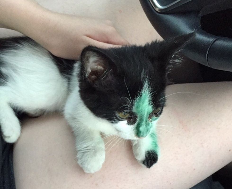 "I found her outside my apartment complex. Her whiskers were half burnt off and someone had covered her in green Sharpie ink. She ran up to me and meowed, alone," reddit user