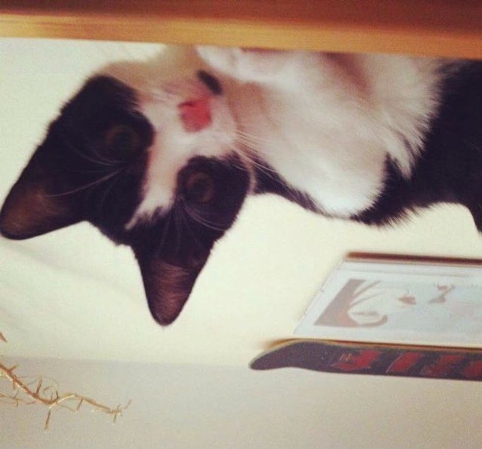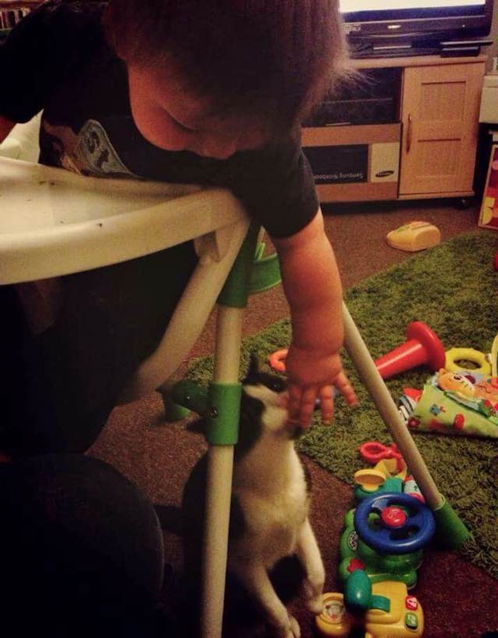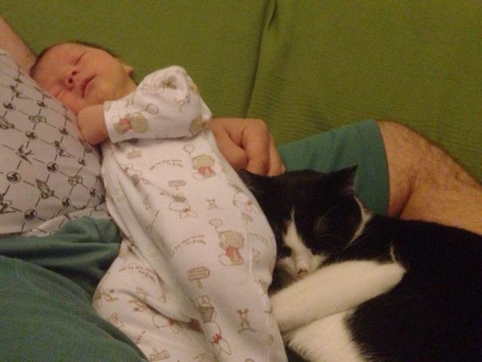 "When I was 8 weeks pregnant with our first we found and took in a stray kitten," Alyssa wrote via imgur. "He was nervous at first but soon settled in."