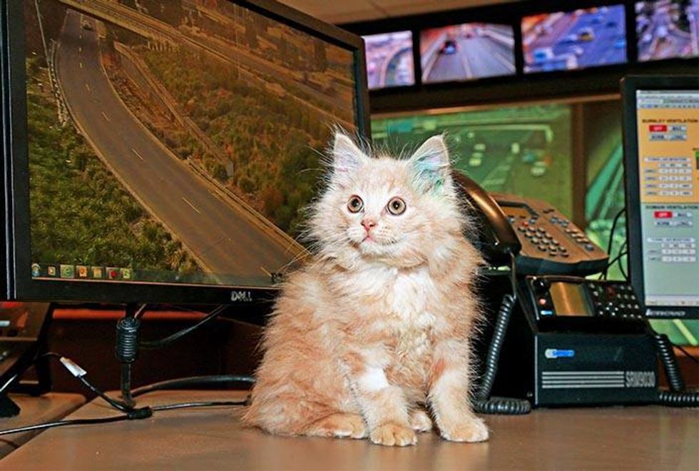 A tiny ginger kitten was spotted wandering in a tunnel by himself. With traffic going right by him, the maintenance workers ran to the rescue.