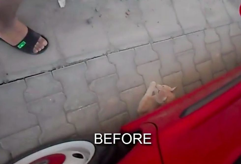 A stray kitten was hiding under a car too scared to come out. A boy came to his aid and offered food and love.