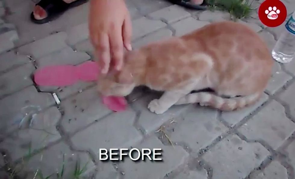 While the kitty was eating, the kind-hearted boy gently petted him on his head, trying to tell the little feline that he was there to help.