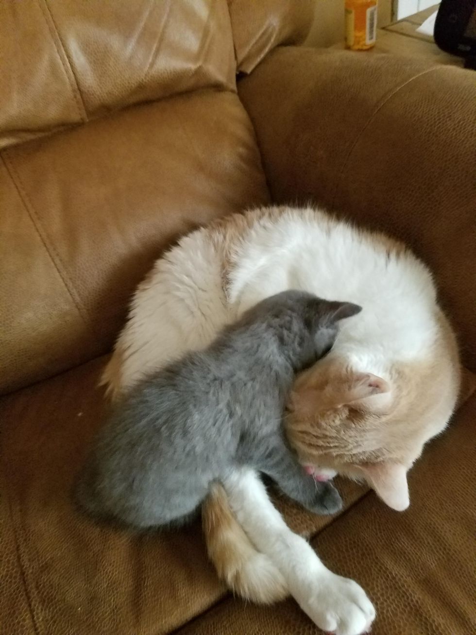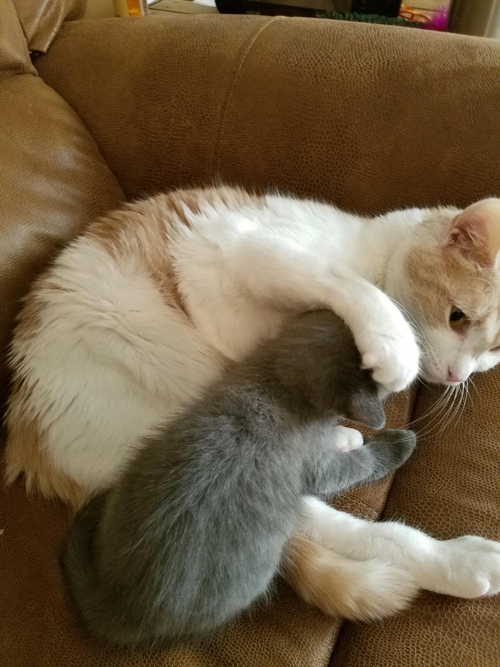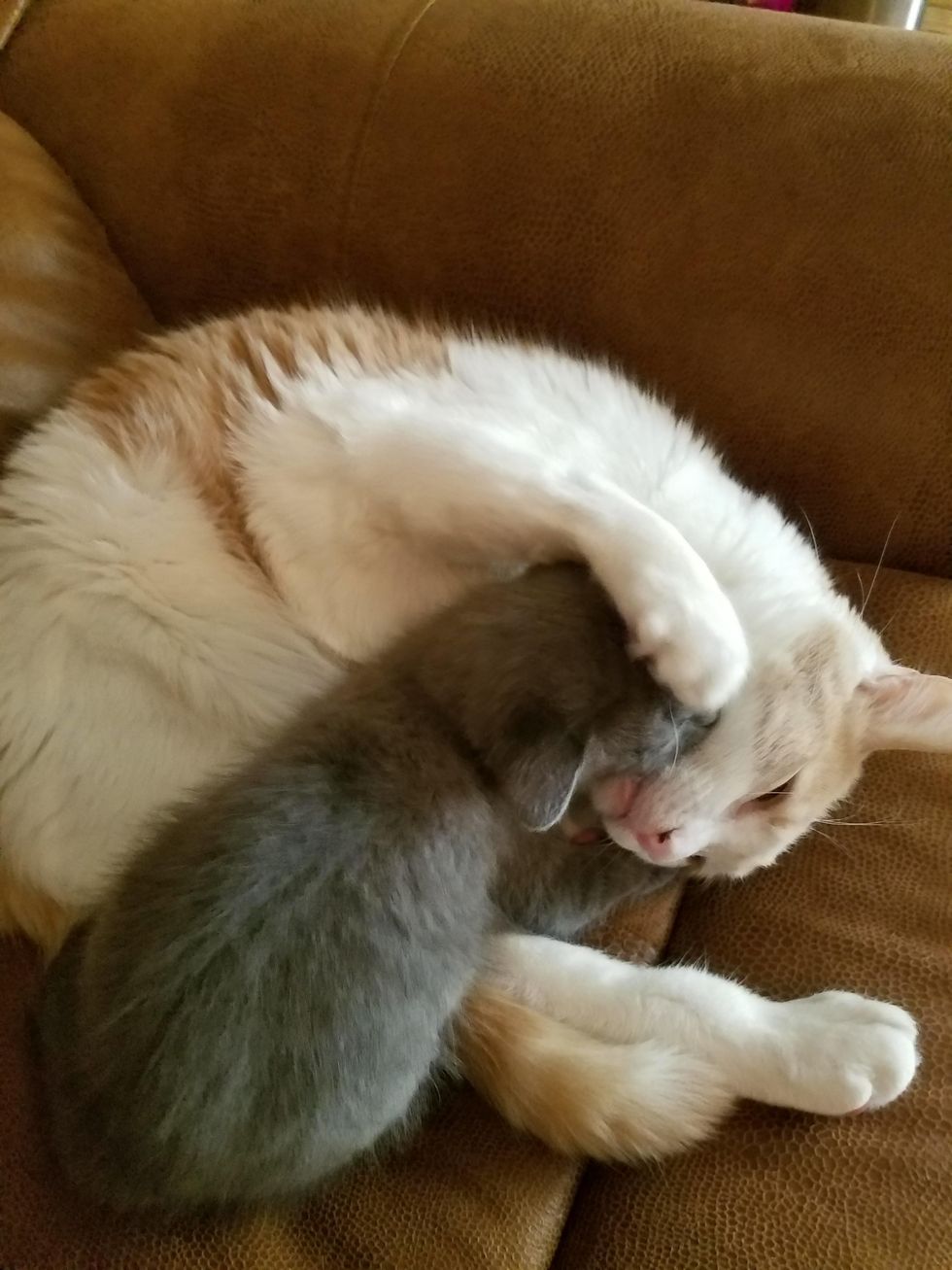 He is a bit confused when Rosalina suckles on his fur, trying to nurse, but he lets her and is purring along.