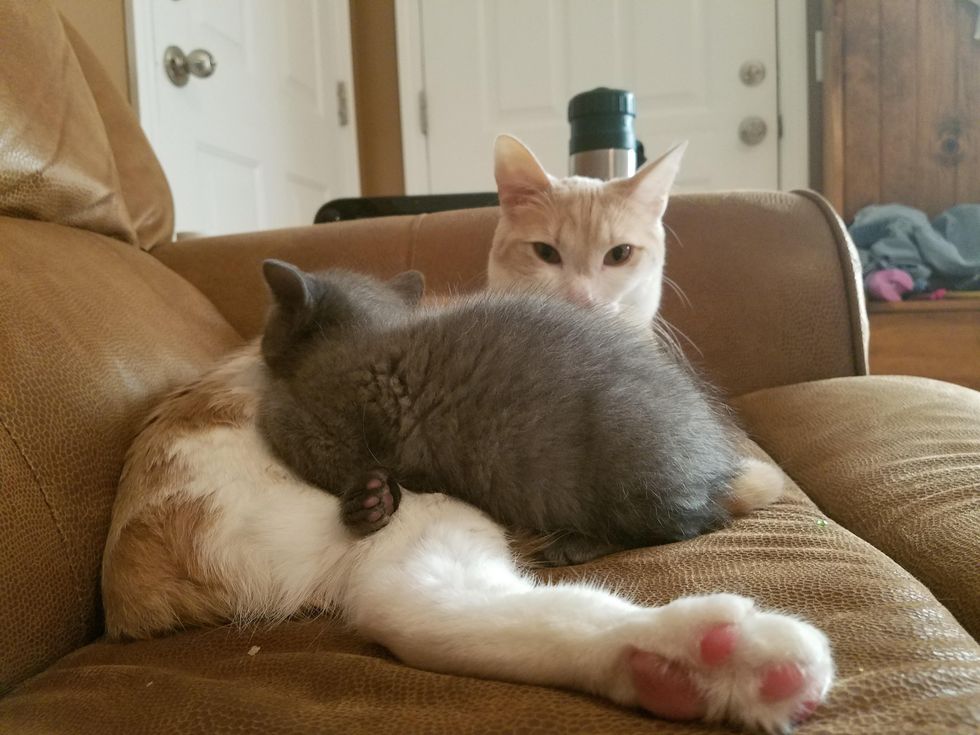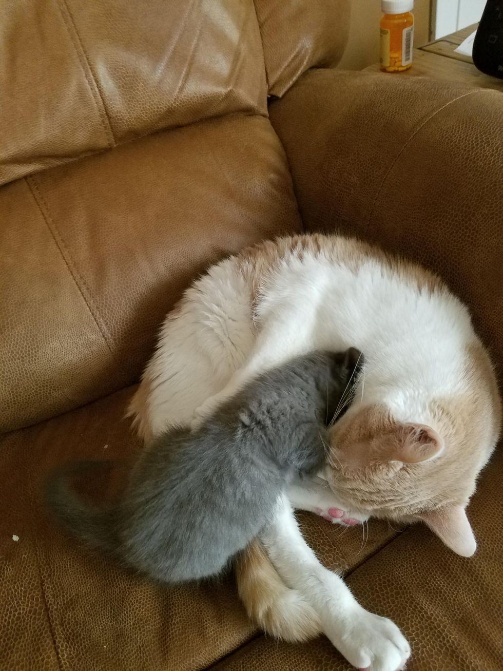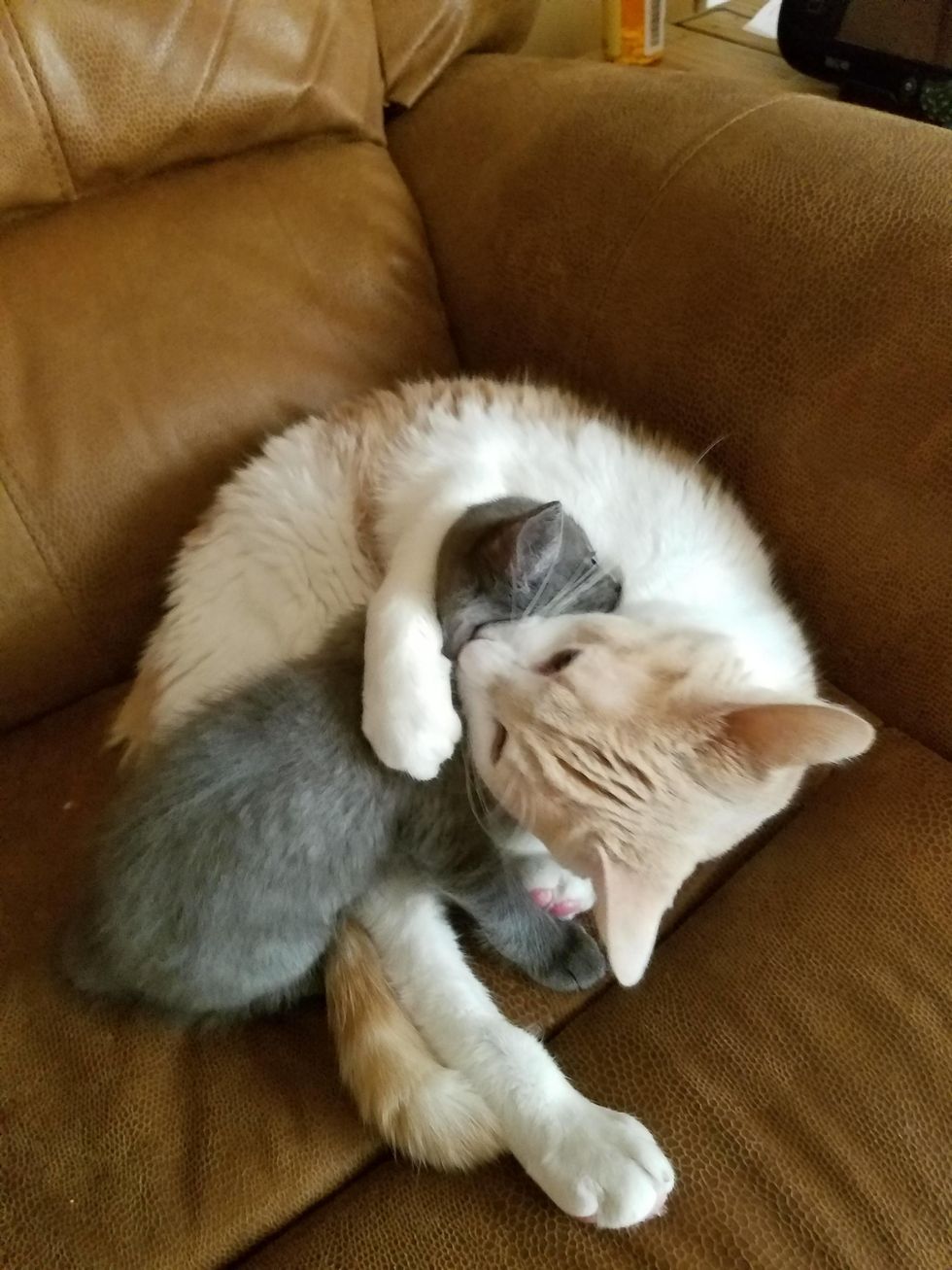 He is a bit confused when Rosalina suckles on his fur, trying to nurse, but he lets her and is purring along.