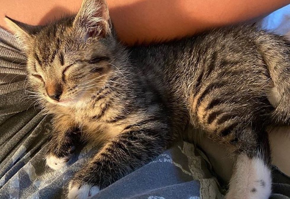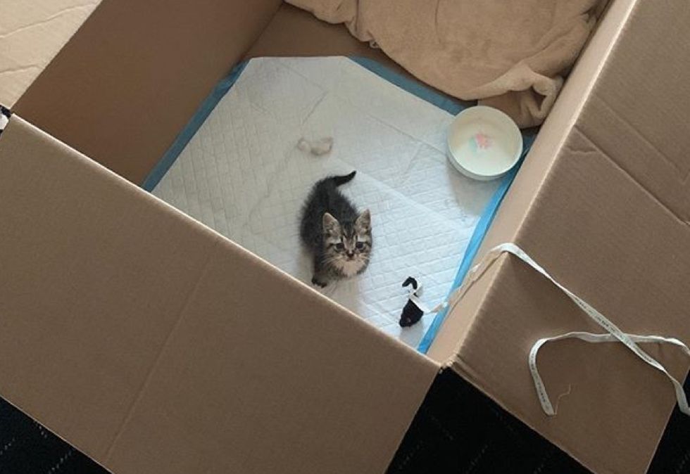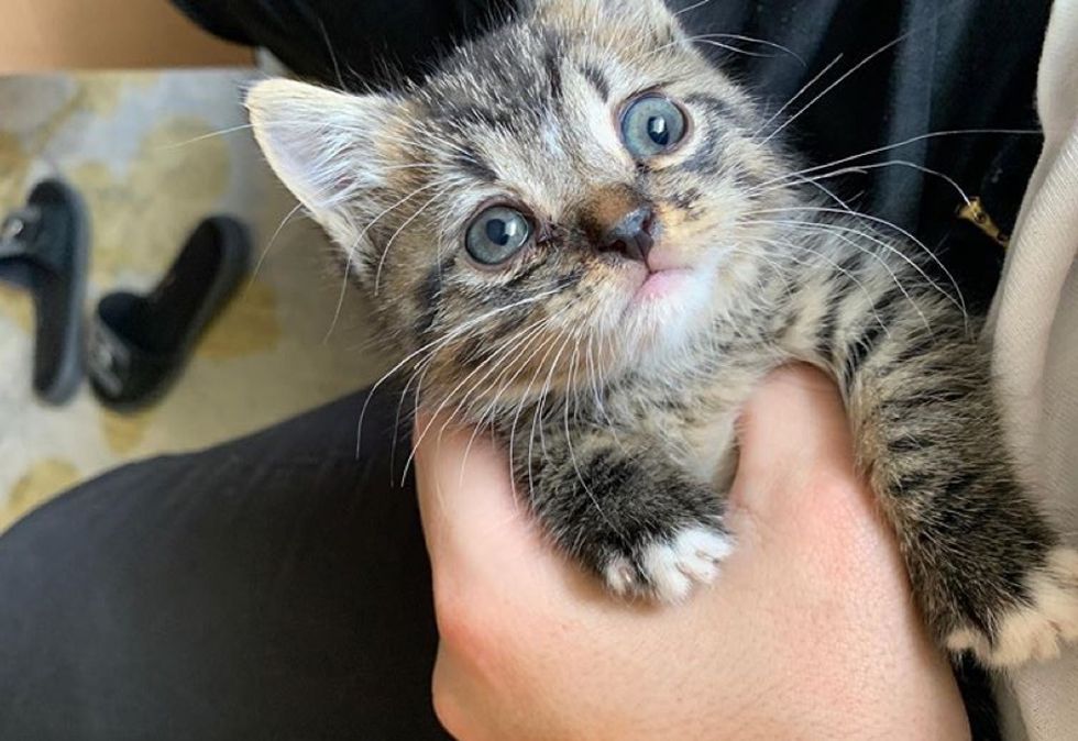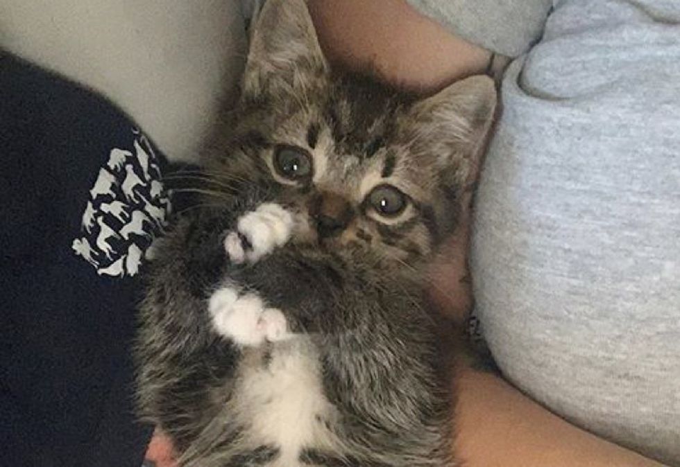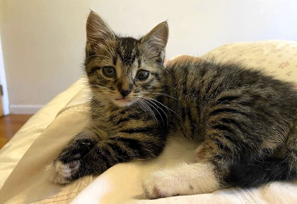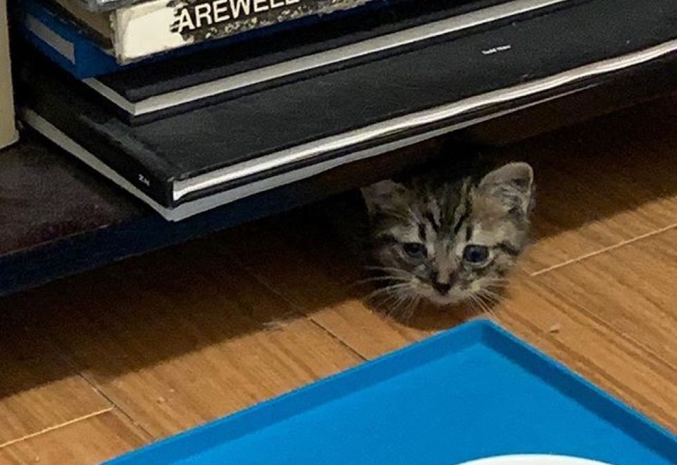 She called out to him and the tiny tabby came running through the door and into her apartment. The maintenance door on their floor was open that day, and they believe that's how the kitten found her way into the building. After asking around their neighbors and looking for a mother cat, they confirmed that the kitten was alone and didn't have a home.