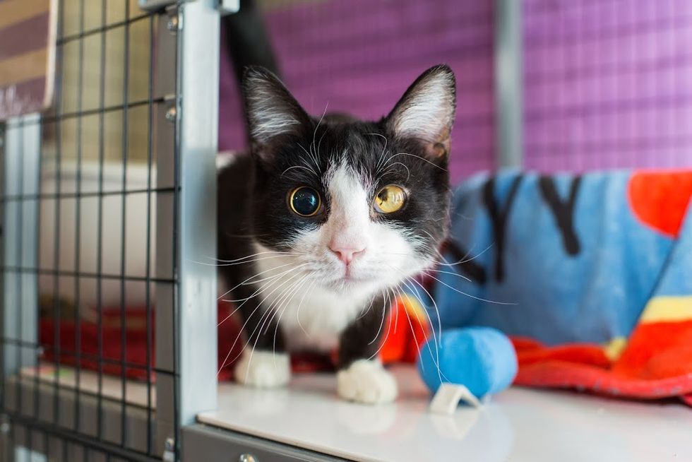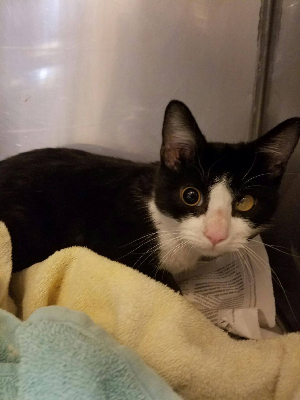 "He was born blind; having one retina detached and the other pupil didn't form correctly." The sweet tuxedo was given a full check up, neutered, and microchipped.