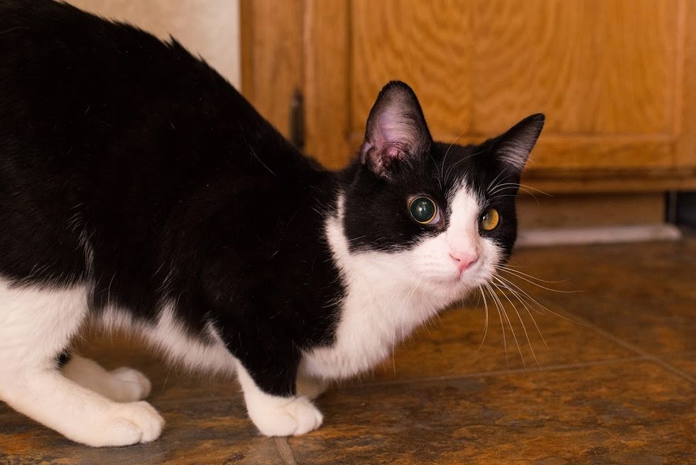 "We aren't sure how he got there, but we do know he was blind, scared, and dirty. Though the people at the tire shop were feeding him, Dudley was still in danger due to the busy streets around the shop, which was also in coyote country," Milo's Sanctuary shares with Love Meow.