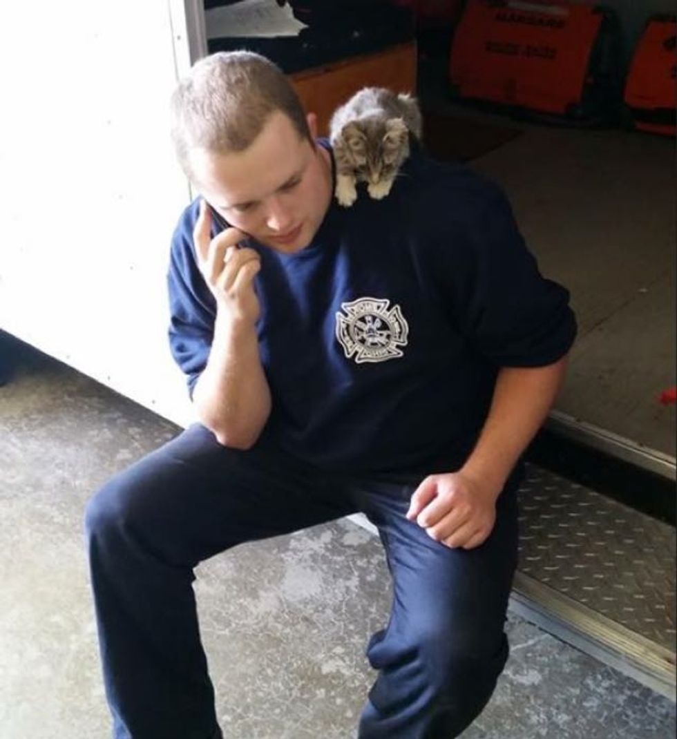 A tiny stray came to a fire department, meowing for love. He climbed onto a fireman's shoulder and that's when the man knew he had to help...