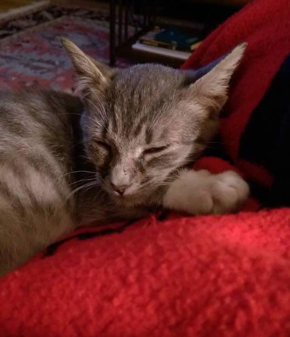 A couple days later my mom took him to the vet, he had 4 types of worms (including lung worms), a few different types of parasites, a respiratory track infection, fleas and a nasty ear infection. So he was far from healthy. My parents were nice enough to foot the bill, once again with the intention of giving him to a family friend who had recently fallen on some hard times (lost their house to a fire, and their cat). However it took ages, nearly 2-3 months for him to be even healthy enough to act like a kitten instead of an exhausted old cat.