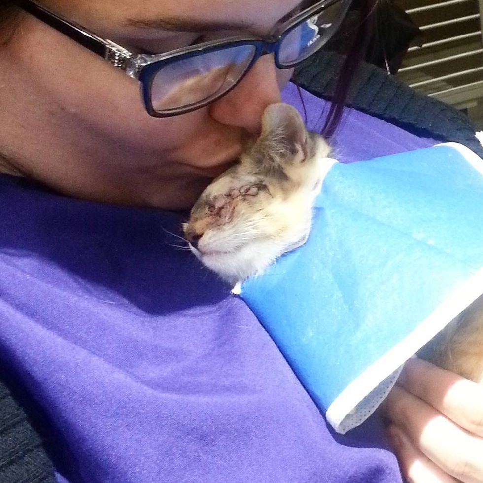The day after the surgery, little Oomi cuddled up to her mom for some snuggles. "The moment I held her, she started purring. I knew she was tough enough to recover!"