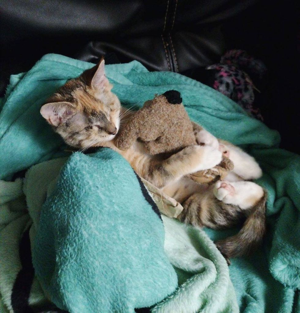Oomi's humans were anxious to say the least, but the little tortie was calm and purring to her humans as if she was trying to comfort them.