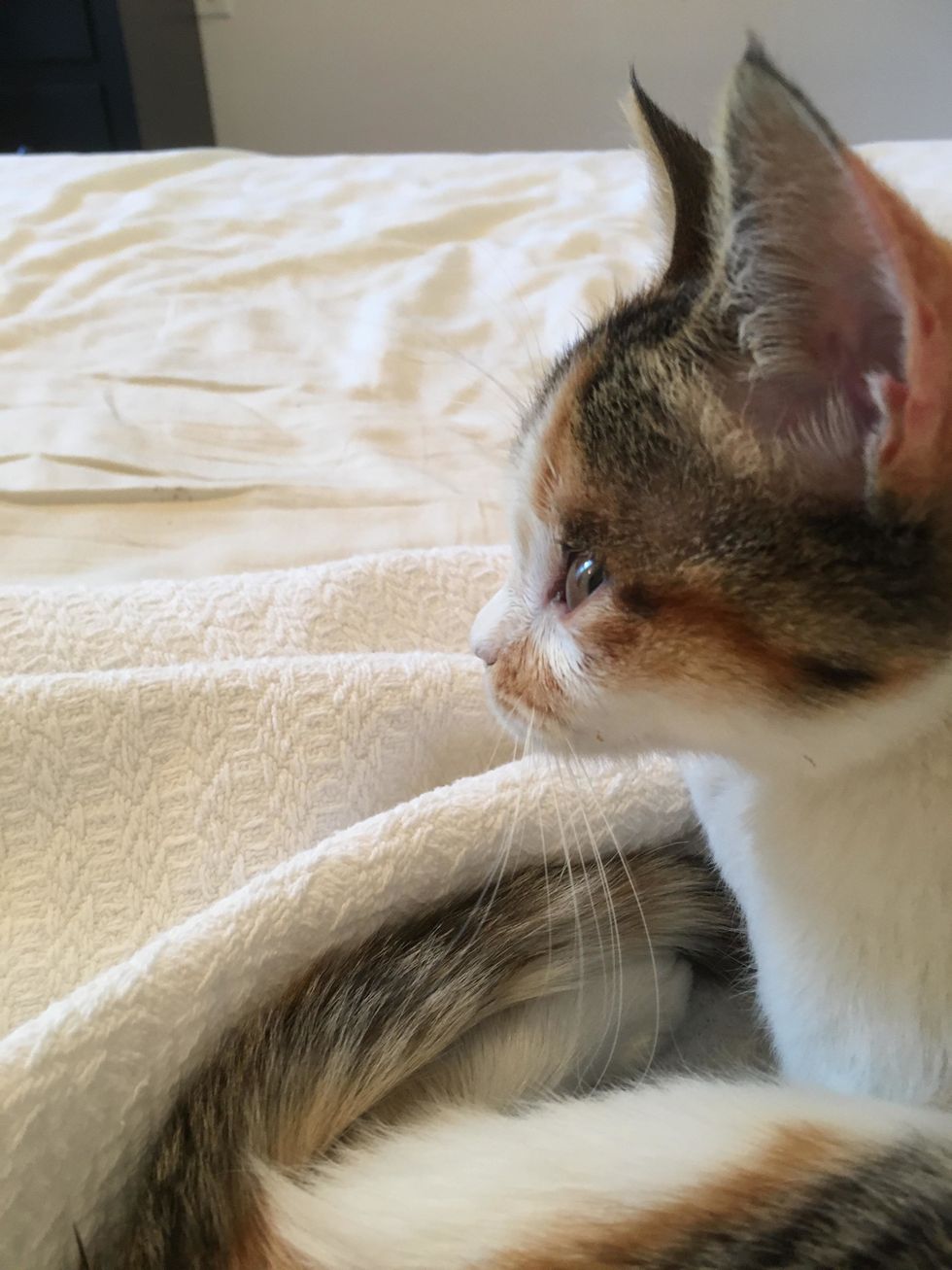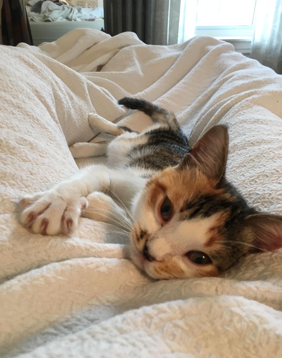 "When she first got here, she was just so exhausted. She spent all of her time in a lap or on a blanket next to a radiator. She was so skinny," Lindsay told Love Meow.