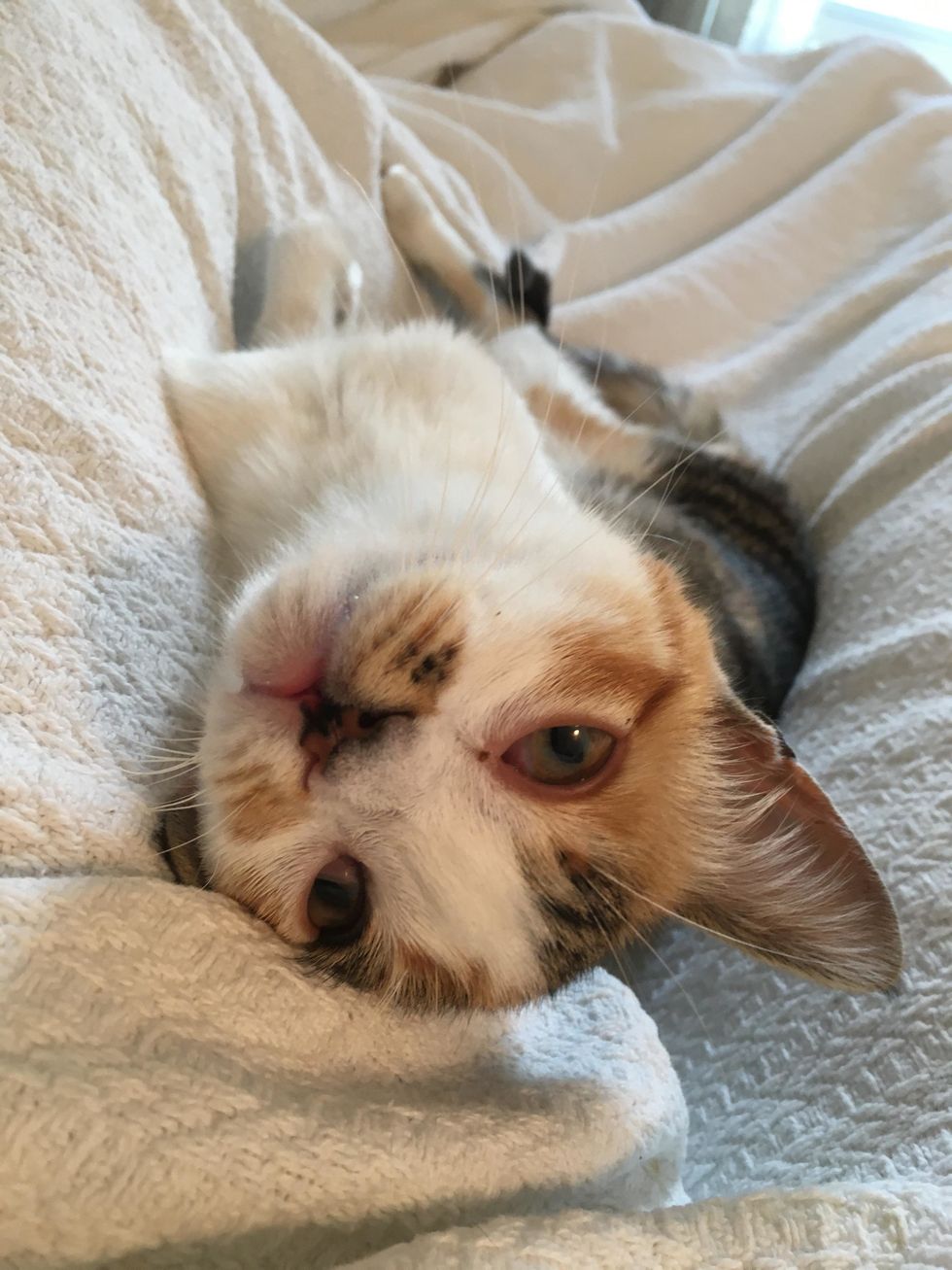 Right away, they noticed her unsteady gait when she walked. The kitty has a cleft palate and a mild case of Cerebellar Hypoplasia (CH), a condition that affects the cat's motor skills. But nothing seems to slow her down.