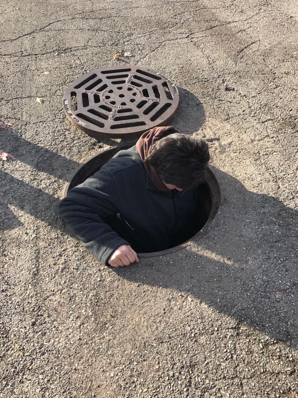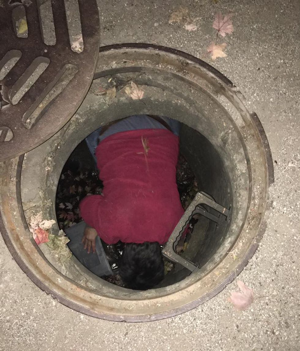 They found a nearby manhole, and rescuer, Stacy, volunteered to crawl down into the murky water and look through the pipes.