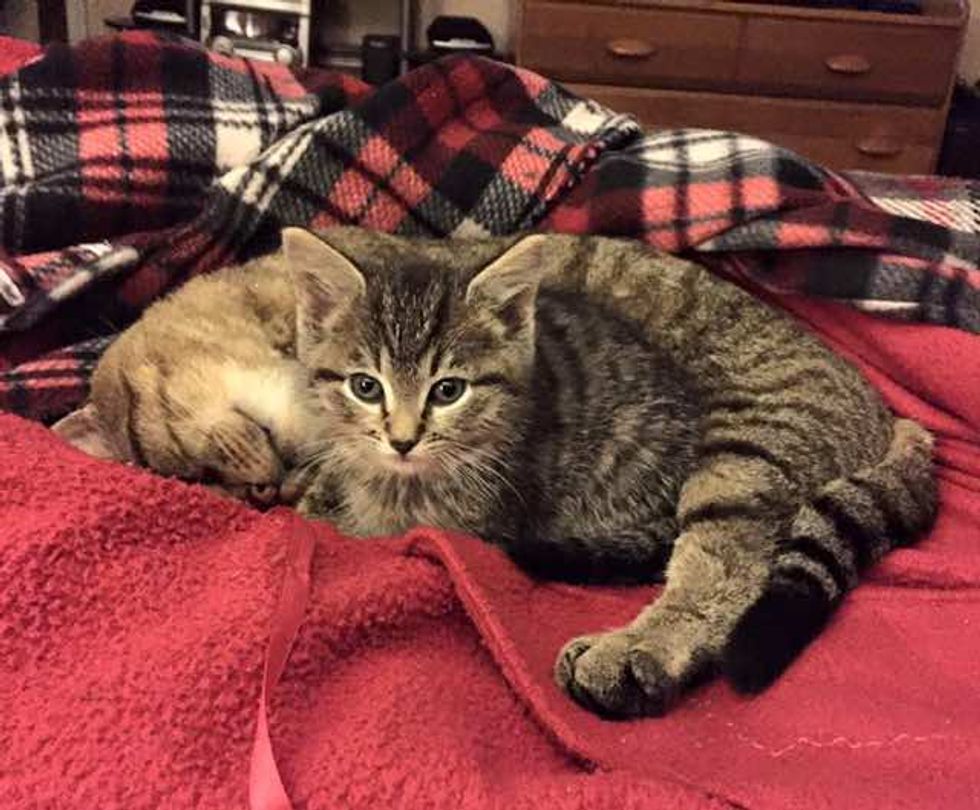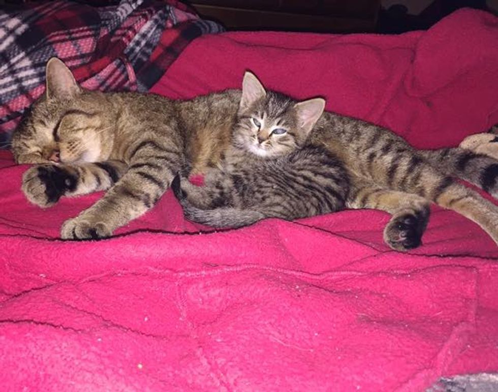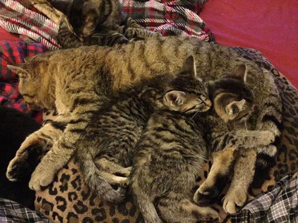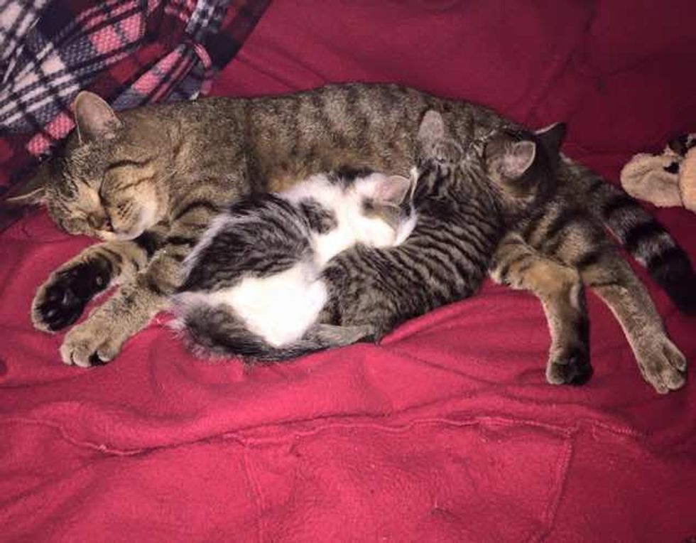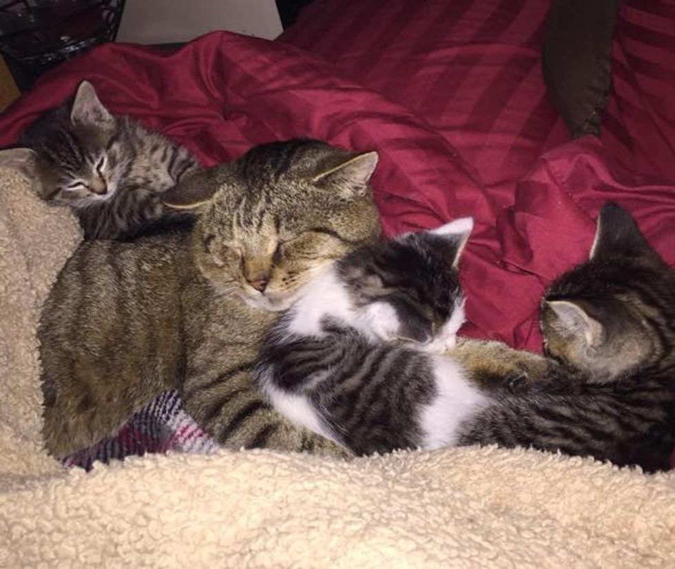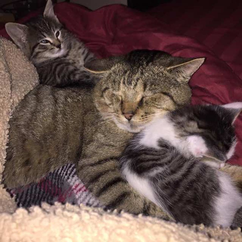 A stray tabby boy is now the papa to three rescue kittens. It took a family 6 months to establish 100% trust with him after he showed up in their yard back in March, but this is the reward!