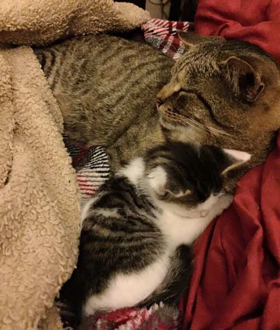 In September, they took in a litter of kittens born to a feral cat mom. It was about the same time Caesar decided he would move into their house. They aren't sure if Caesar is the kittens' real papa, but one thing is certain: this tabby cat adores these little fur babies just like his own.