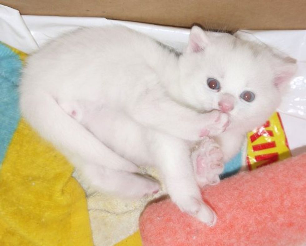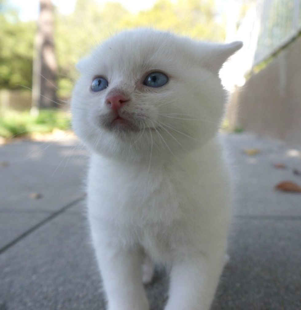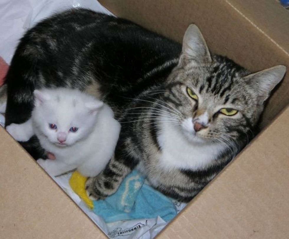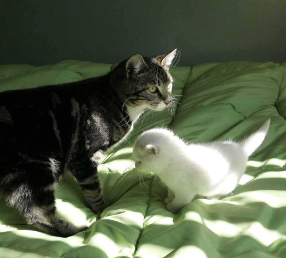 A stray tabby cat mama gave birth to a little white kitten. They were found in a cabin by a kind person who goes by wingswing on reddit. He has been feeding and caring for the two since the stray tabby first came to him.