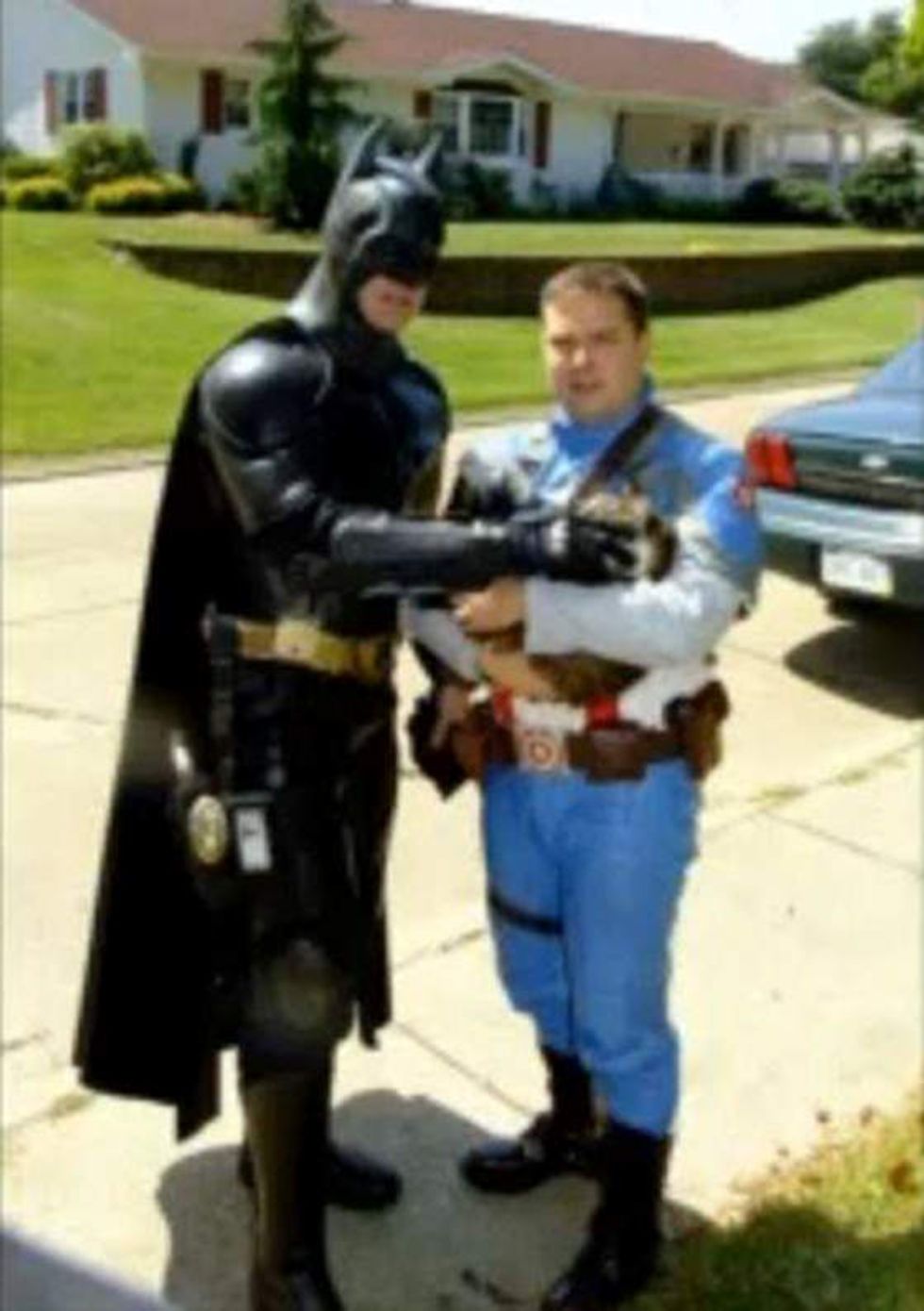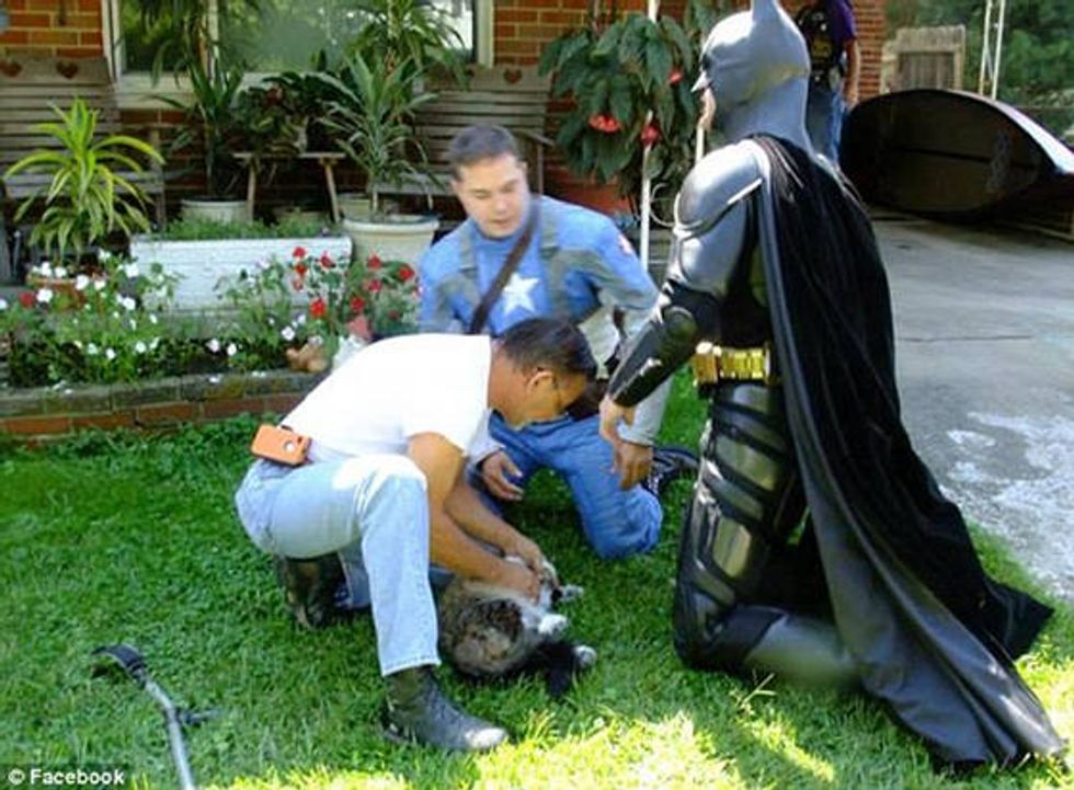 Two men dressed as Batman and Captain America save a cat from a burning house in West Virginia Saturday