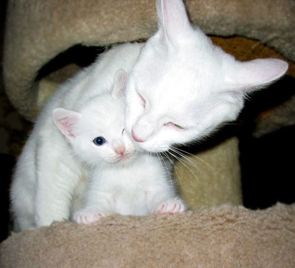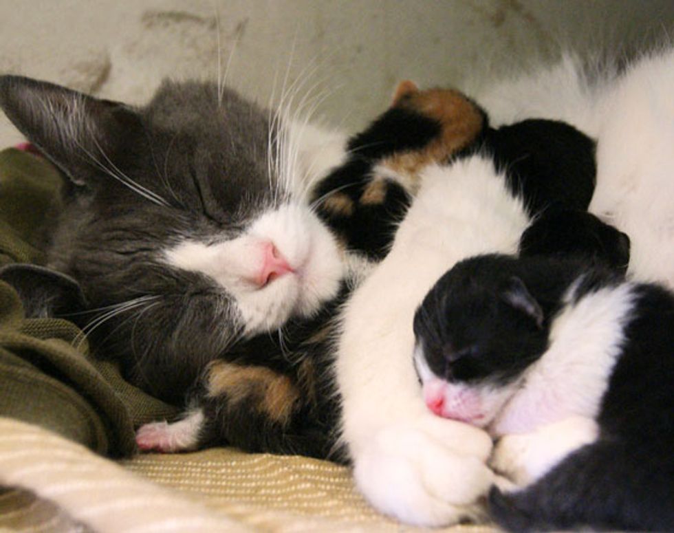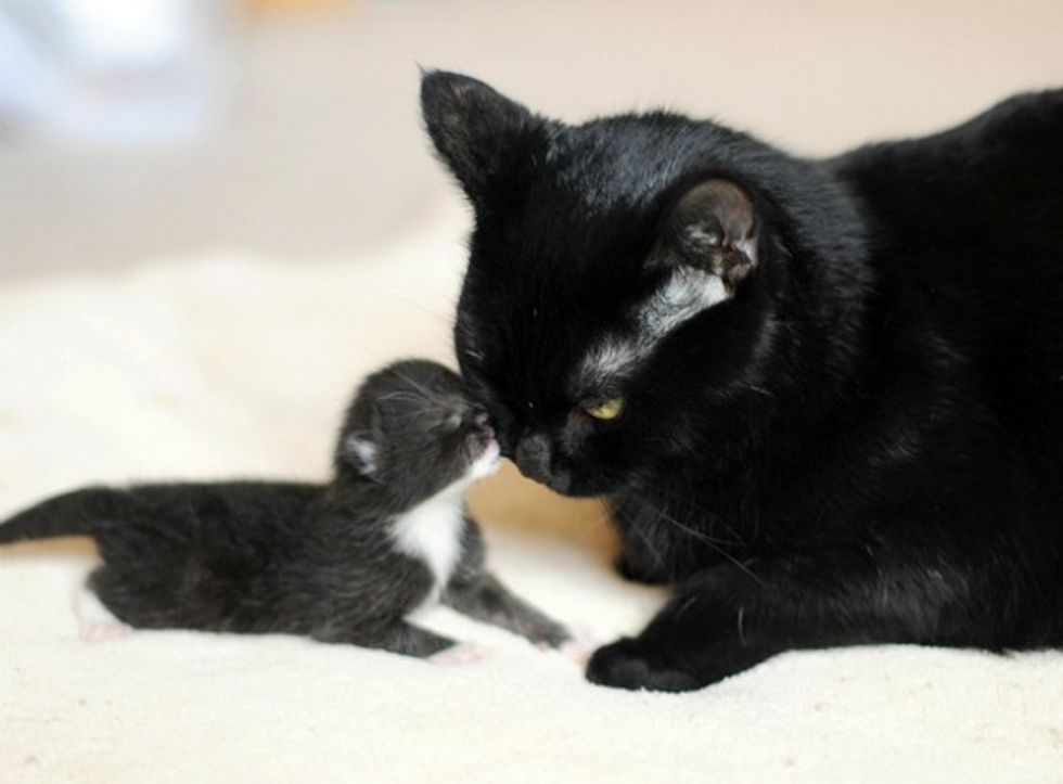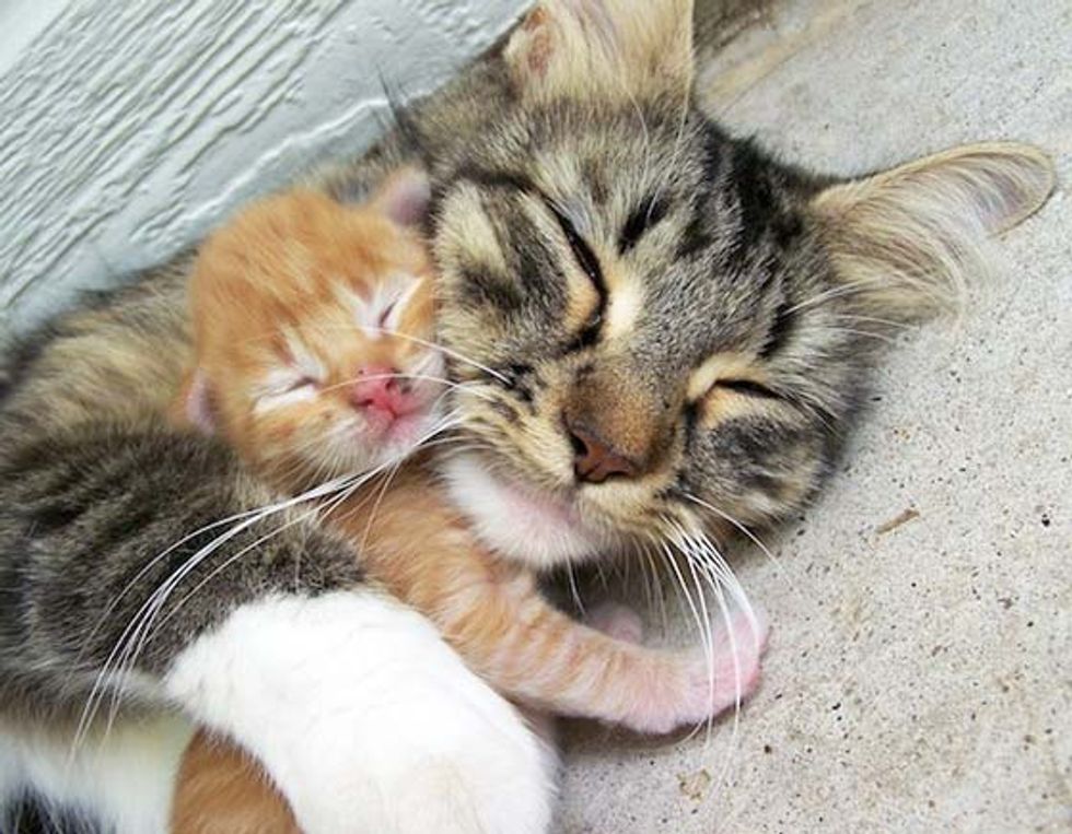 Cat mama wraps her tiny day old babies around her, holding them tight in her arms. More photos.