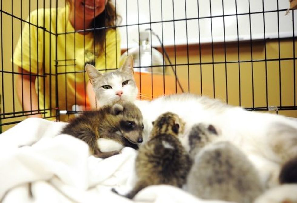 10 month old mama cat J.J. fell in love with a rescue baby raccoon when they were placed together at the shelter on Monday, April 2. A mother’s instinct kicked in, J.J. adopted the orphan raccoon immediately after they met and started nursing and cleaning it as if it was her own. Full story.