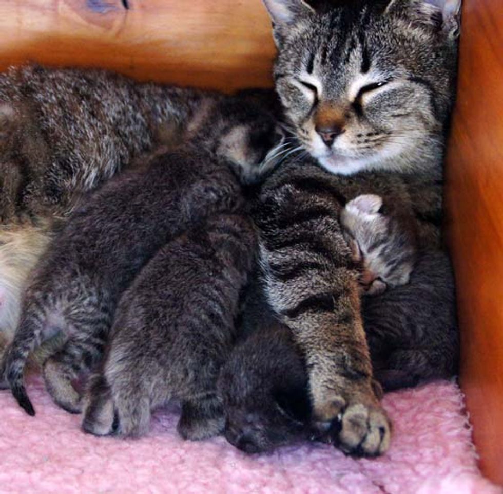 Millie gave birth to five adorable kittens, and she is there for them every step of the way. "All of them are growing like weeds. Millie is a super Momcat and is taking great care of them," Christine. Full story and photos.