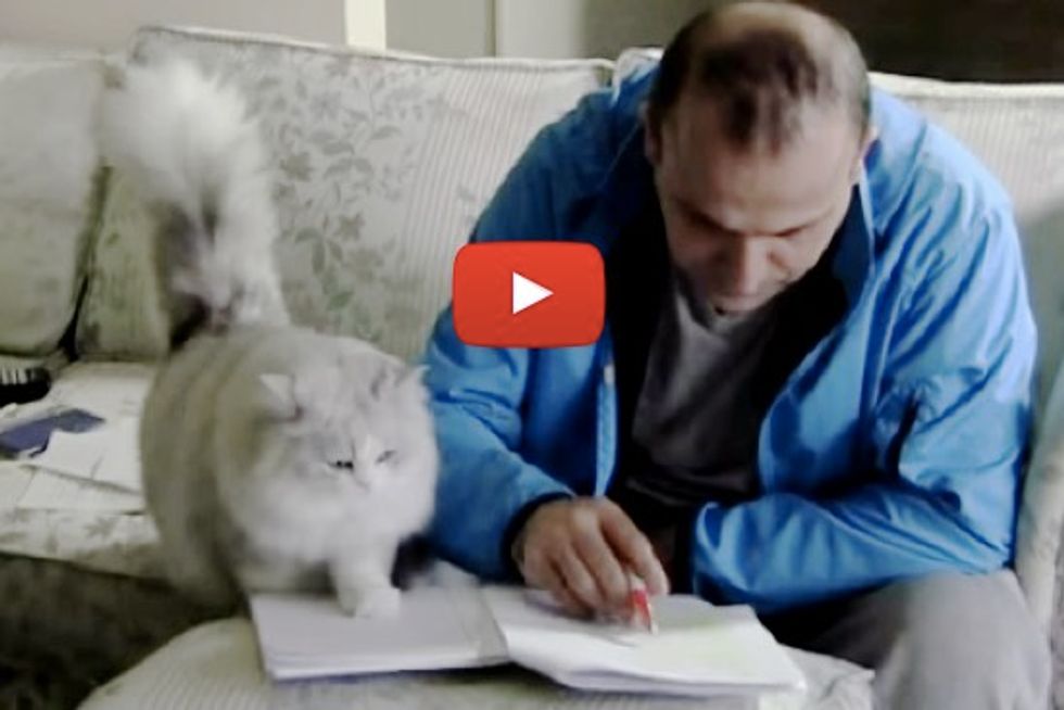 Sushi the fluffy cat wants attention from her dad no matter what he's doing. You can tell they love each other.