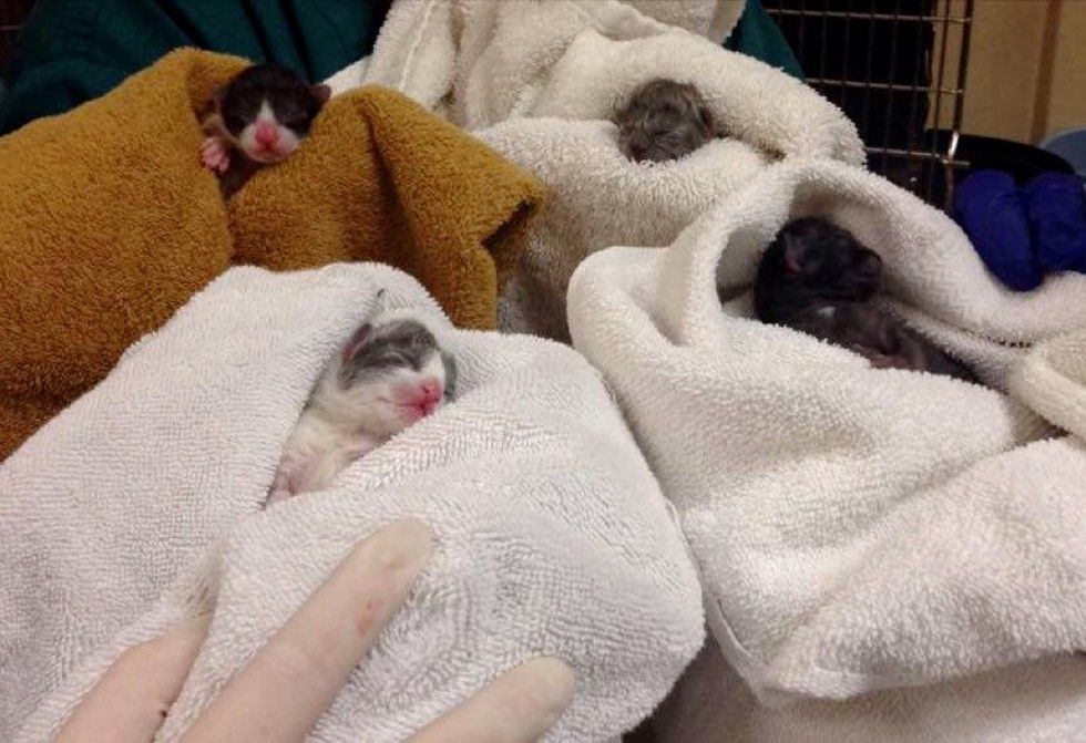 Four tiny kittens born through a C-section.