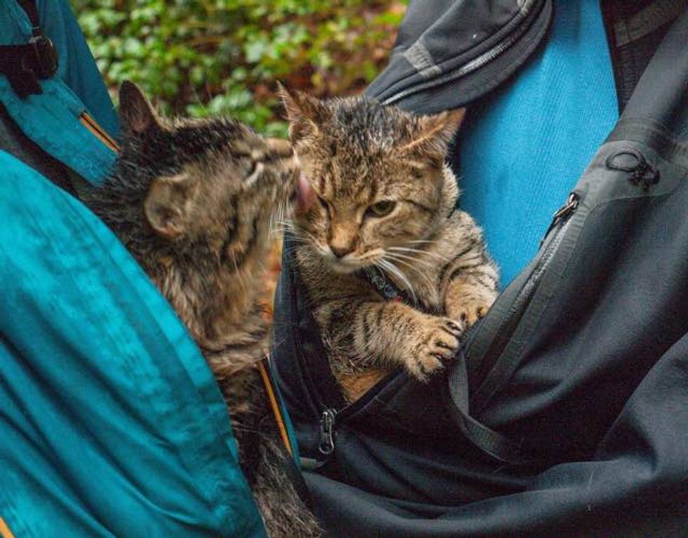 Two tabby brothers saved from a garbage bin are now following their rescuers everywhere they travel and have become adventure cats.