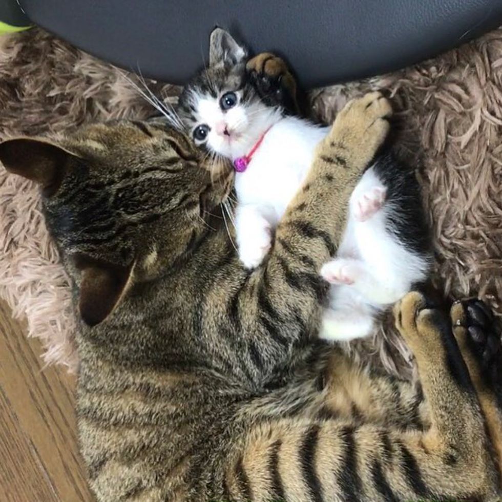 Their tabby cats took them in and helped raise them into gorgeous kitties!