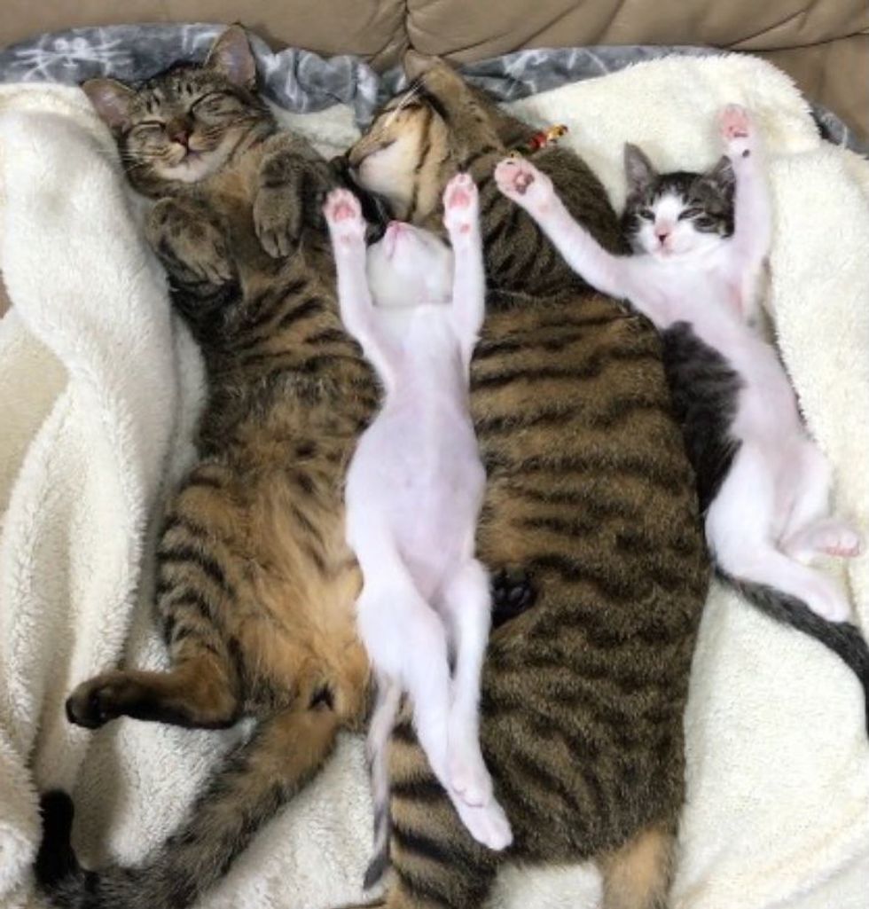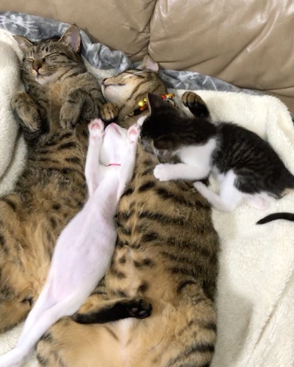 The tabbies, Ito and Ban, took the orphaned babies (Mei and Mu) under their wing, and started grooming them and giving them plenty of cuddles throughout the day.