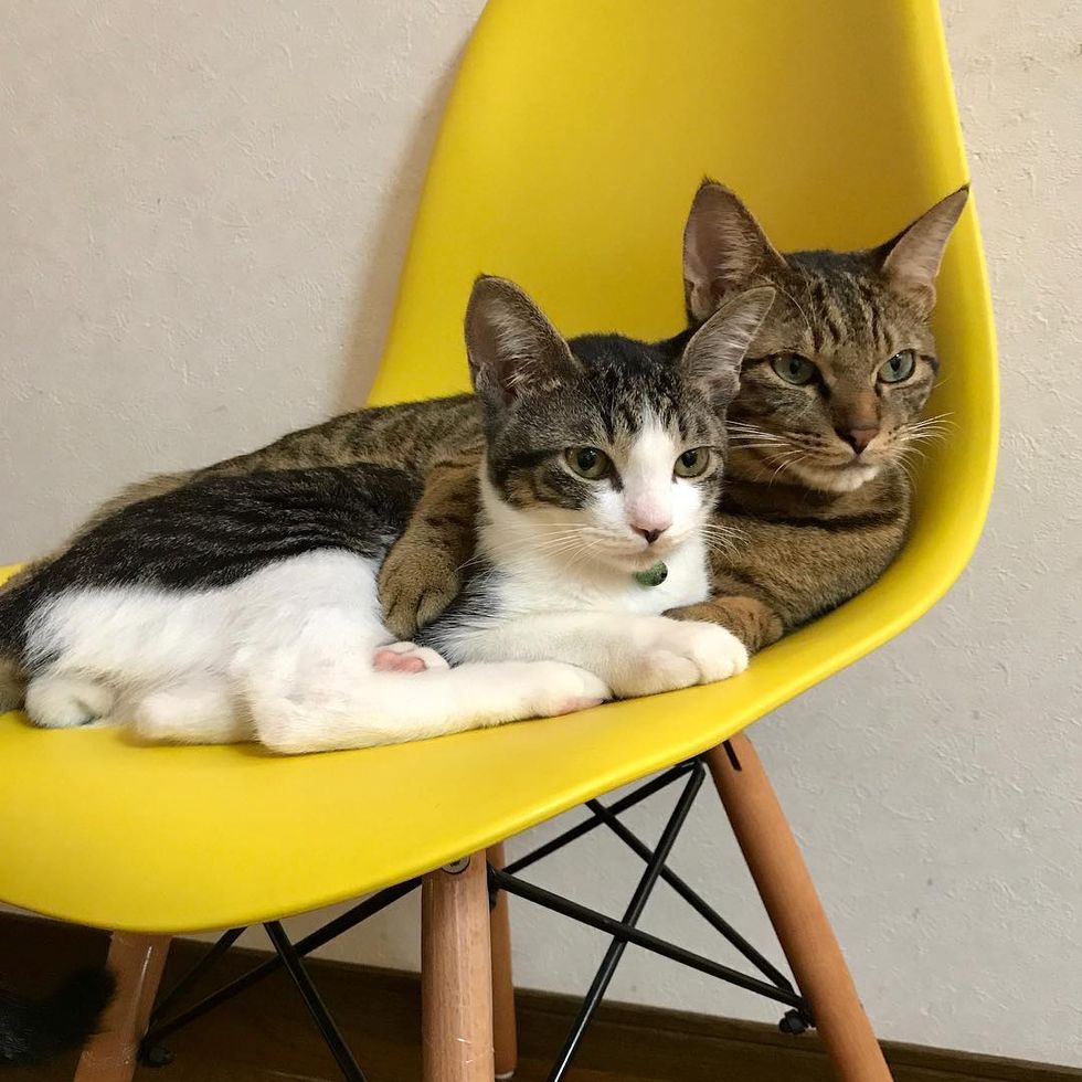 Mei and Mu have become very attached to the tabbies that they follow them everywhere they go.
