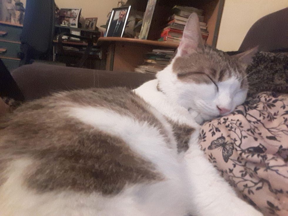 The kitty was just skin and bones, covered in filth. Her tail was missing and she was in bad shape. Theo took her in and brought her back to health.