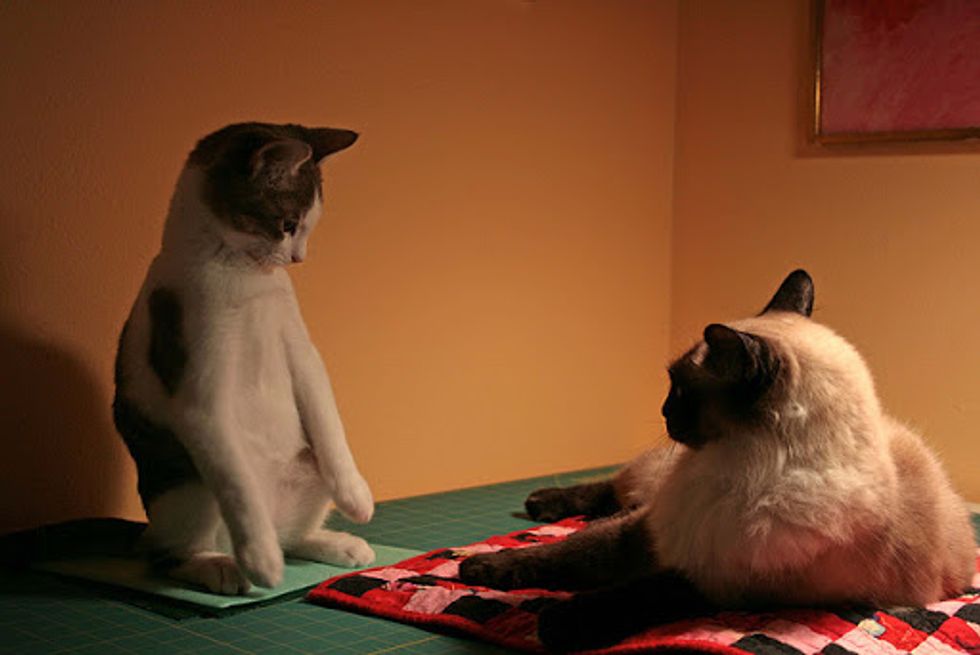 "They could be from the same litter, if they weren't two years apart. Mother has been following Teek around all day. She sniffs where he sniffs, eats when he eats, plays with the same toys just after he's finished. Ridiculously cute."