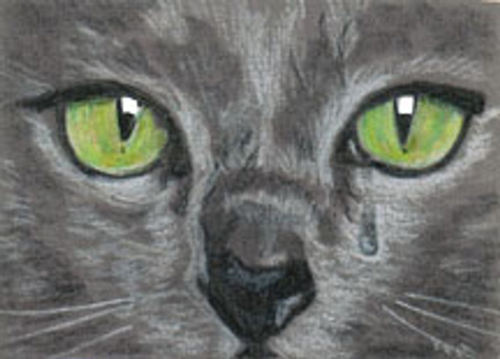 The picture in this article is a colored-pencil painting I did of Bird. He is the loveliest shade of grey bound with starlight. Bird was Caitie's cat; he had struggled into her lap and claimed her as she looked over all the kittens she had to choose from. He trailed after her like a puppy, allowed himself to be dressed in baby clothes and would chirp to her like a, well a bird.