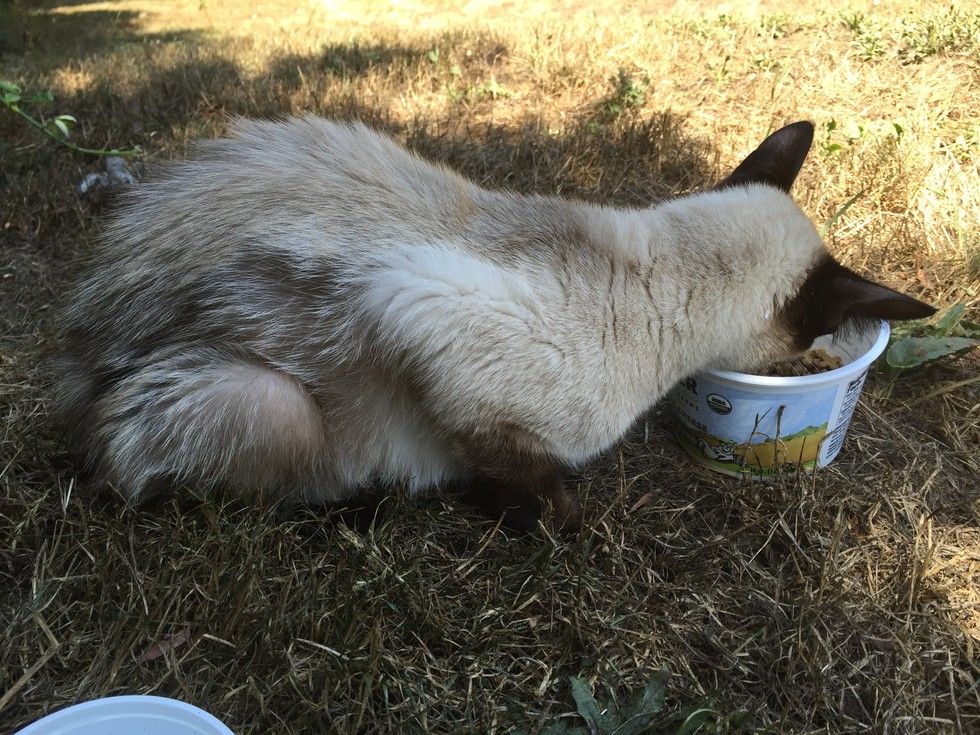 The kitty was very hungry, so they gave her some food which she quickly devoured.
