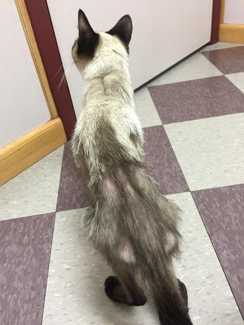 "She explored the vet's office and was very quizzical, you can see just how thin she was with this photo. She was pretty weak, walked around crouched down and didn't have any energy to jump on anything. They checked for a micro chip and one wasn't found."