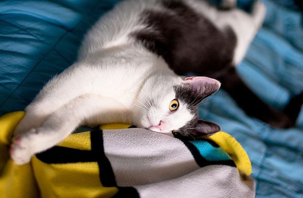 As Sam has grown, it's become pretty clear that he's a *really* happy cat. Sometimes, even before he enters a room you hear him coming because he is purring as he comes to find you. His tail is almost always high in the air as he makes his way through his domain, making sure all is well. He is always the first to greet at the door when we come home and the last to say his goodnights at night. In my case, he can't fit in my lap any more, but he always cuddles close or sprawls partway across me, purring the entire time. He loves to play and if you look at pictures of him, his sheer exuberance comes through loud and clear.