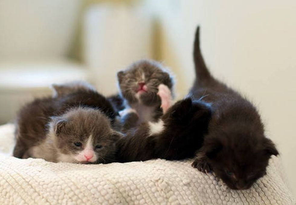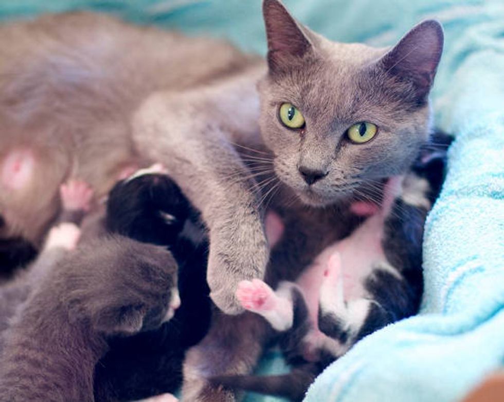 Protective and loving mama cat never leaves her kittens out of her sight.