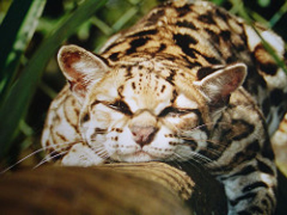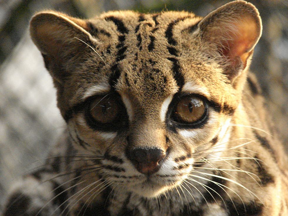 The Margay has two large round eyes that provide excellent vision when hunting at night. Their eyes glow brightly in the dark like two light bulbs. These nocturnal felines are very secretive and often find a remote, less populated area to reside. They mainly feed on tree dwelling rats, opossum, birds, insects, monkeys and squirrels.