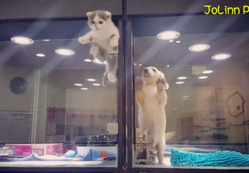 According to the owner of the store, the kitten and the puppy saw each other for the first time when they were placed in two adjacent enclosures.