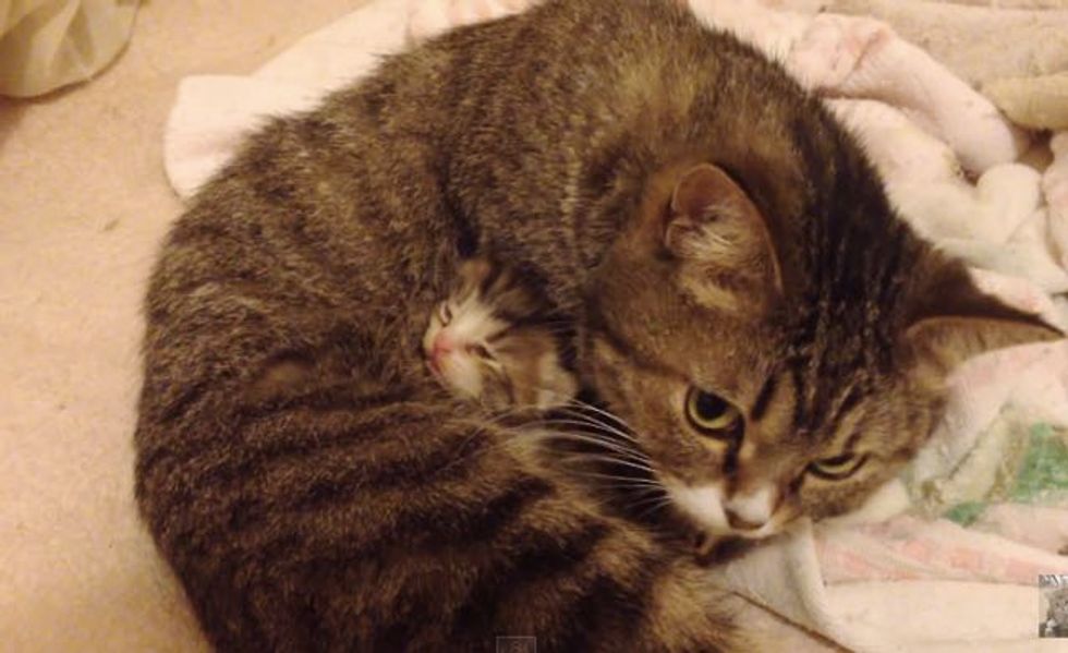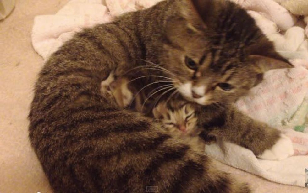 This tabby cat is resting on her favorite blankie, but look closer.... There's something tucked in her belly!